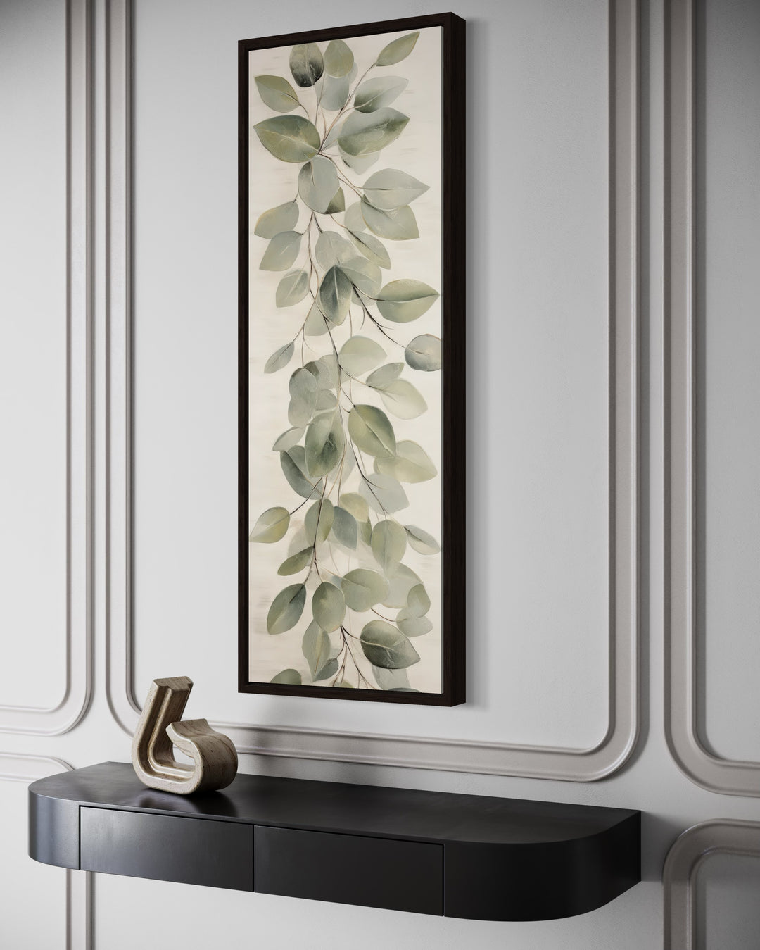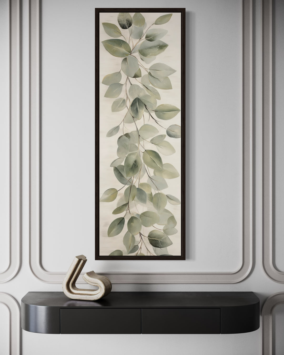 Tall Narrow Vintage Leaves Sage Green Beige Framed Canvas Wall Art
