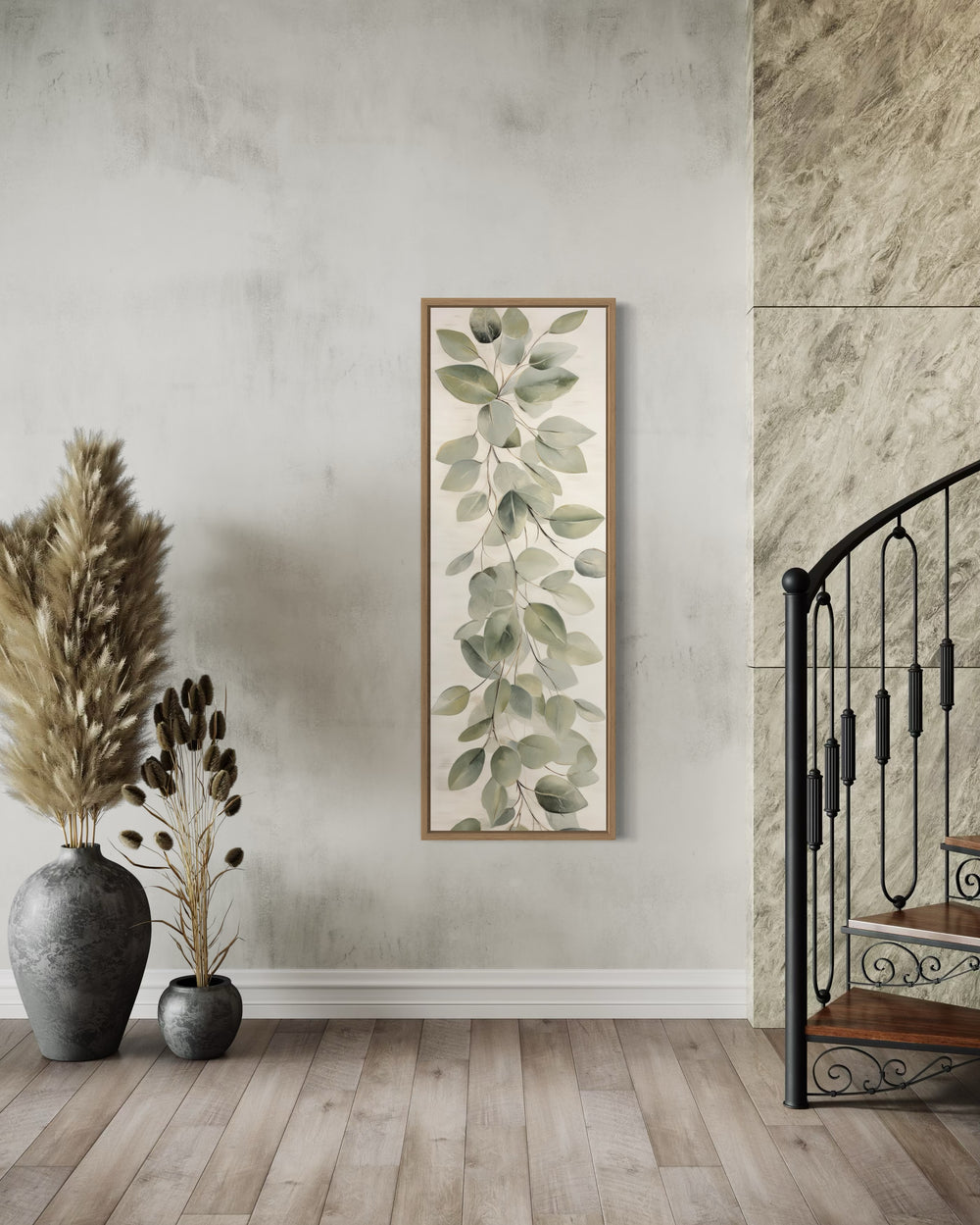 Unser hoher, schmaler Leinwanddruck mit einem Vintage-Blättergemälde ist ein zeitloses Kunstwerk, das Ihrem Interieur eine elegante Note verleiht. Mit zart gemalten salbeigrünen Blättern vor einem neutralen beigen Hintergrund strahlt dieses lange, vertikale Kunstwerk eine beruhigende und anspruchsvolle Atmosphäre aus. Sein retroinspirierter Aquarellstil vermittelt ein Gefühl von Nostalgie und verbindet natürliche Schönheit perfekt mit einer Vintage-Ästhetik. Dieser Leinwanddruck ist ideal für hohe, schmale Räume und verwandelt leere Wände in einen heiteren Blickfang. Ob als eigenständiges Stück oder in Kombination mit ergänzender Dekoration, die komplizierten Blattmuster bieten eine Verbindung zur Natur und behalten gleichzeitig einen minimalistischen Charme. Seine ausgewogene Komposition sorgt dafür, dass es sowohl moderne als auch klassische Innenräume aufwertet. Dieses Retro-Blattkunstwerk wurde für müheloses Styling entworfen, ist gerahmt und fertig zum Aufhängen, was es zu einer praktischen Ergänzung für Ihr Zuhause macht. Werten Sie Ihre Einrichtung mit diesem atemberaubenden, hohen Wandbild auf, das Vintage-Eleganz und natürliche Inspiration kombiniert.