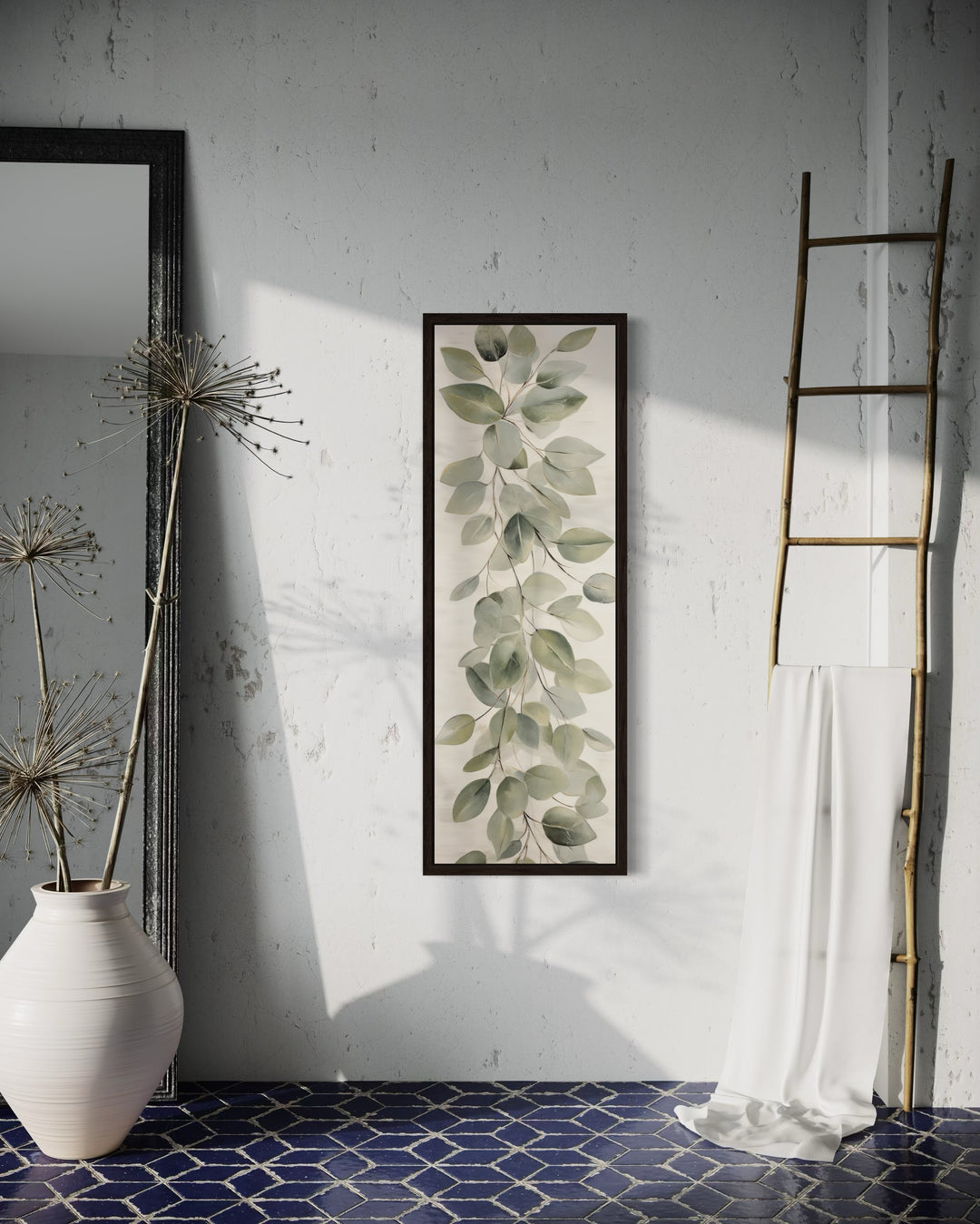 Dieses hohe, schmale Vintage-Wandbild mit Blättern passt perfekt zu rustikalen, bäuerlichen oder retro-inspirierten Innenräumen. Sein vertikales Design macht es zu einer ausgezeichneten Wahl für schmale Wände, Flurnischen oder als dekorativer Akzent neben Türen und Fenstern. Dieses Kunstwerk ist ideal für Wohnzimmer, Schlafzimmer oder sogar Eingangsbereiche und verleiht gemütlichen Räumen Charme und Charakter. In modernen, minimalistischen Häusern bietet das natürliche Blattdesign einen subtilen Hauch von Textur und Wärme. Für Bohème- oder eklektische Stile passt die Retro-Ästhetik wunderbar zu geschichteten Texturen und lebendigen Accessoires. Die zeitlose Eleganz des Stücks sorgt dafür, dass es in traditionellen Innenräumen hervorsticht und sich gleichzeitig nahtlos in zeitgenössisches Dekor einfügt. Verwandeln Sie Ihren Raum mit diesem hohen Wandbild, das die Schönheit des Vintage-Stils und die Anmut der Natur zelebrieren soll, in einen ruhigen Rückzugsort.