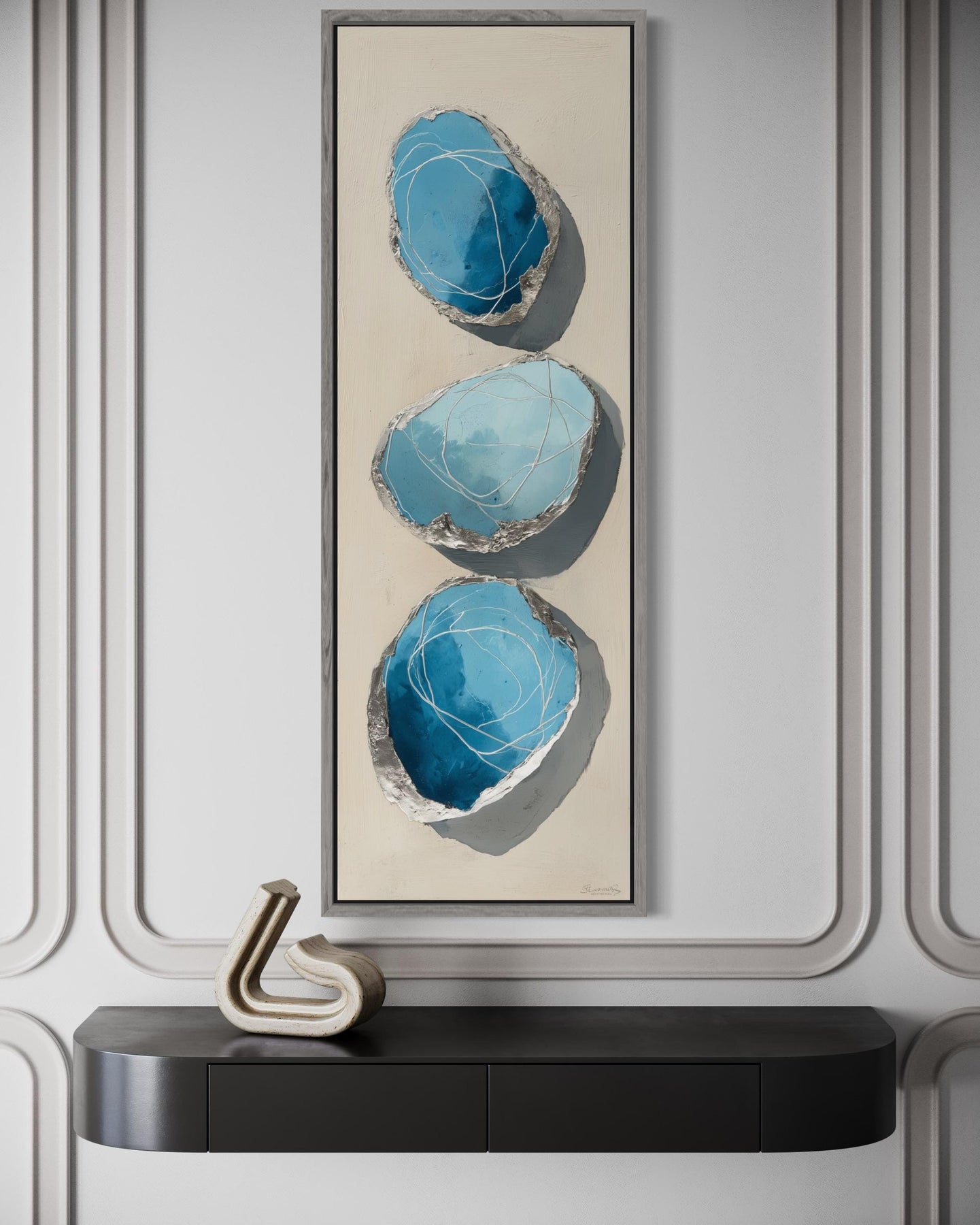 Unser schmales, hochformatiges Wandbild in Blau und Silber ist ein moderner Leinwanddruck mit drei abstrakten Steinen, die sanft übereinander vor einem neutralen Hintergrund angeordnet sind. Jede Form ist in leuchtenden Blautönen mit weichen Übergängen von Aquamarin zu tiefem Kobaltblau dargestellt und erweckt so den Eindruck von marmorierten Mineralien oder fließendem Wasser in Glas. Silberne Konturen zeichnen die Ränder jedes Steins nach und sorgen für einen klaren Kontrast und eine geometrische Form, die die Formen schwerelos und doch geerdet wirken lässt. Die Anordnung der Steine folgt einem absteigenden Rhythmus – der größte unten, der kleinste oben – wodurch ein natürlicher visueller Fluss entsteht, der den Blick nach oben lenkt. Die Leinwand hat eine dezente Körnung, die an die Weichheit von Papier oder Stoff erinnert, und die gesamte Komposition wirkt ruhig, klar und minimalistisch. Dieses hohe Format interpretiert organische Balance modern und verbindet natürliche Inspiration mit abstrakter Präzision. Das Kunstwerk schlägt eine Brücke zwischen Schlichtheit und Raffinesse und ist so meditativ wie stilvoll. Ob aus der Ferne oder aus der Nähe betrachtet, die Details strahlen ruhige Klarheit und sanfte Eleganz aus. Unser blau-silbernes Gemälde verleiht dem vertikalen Raum durch moderne blau-silberne Wandkunst skulpturale Anmut.