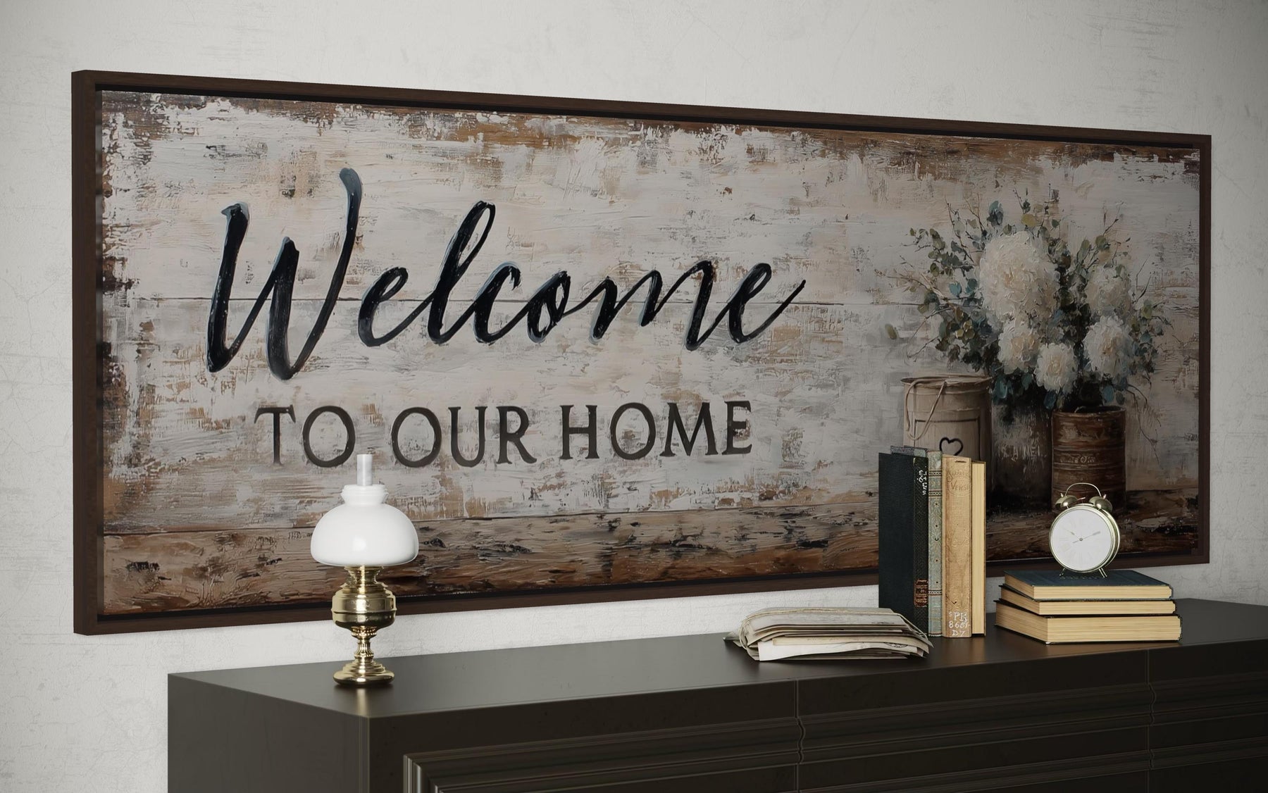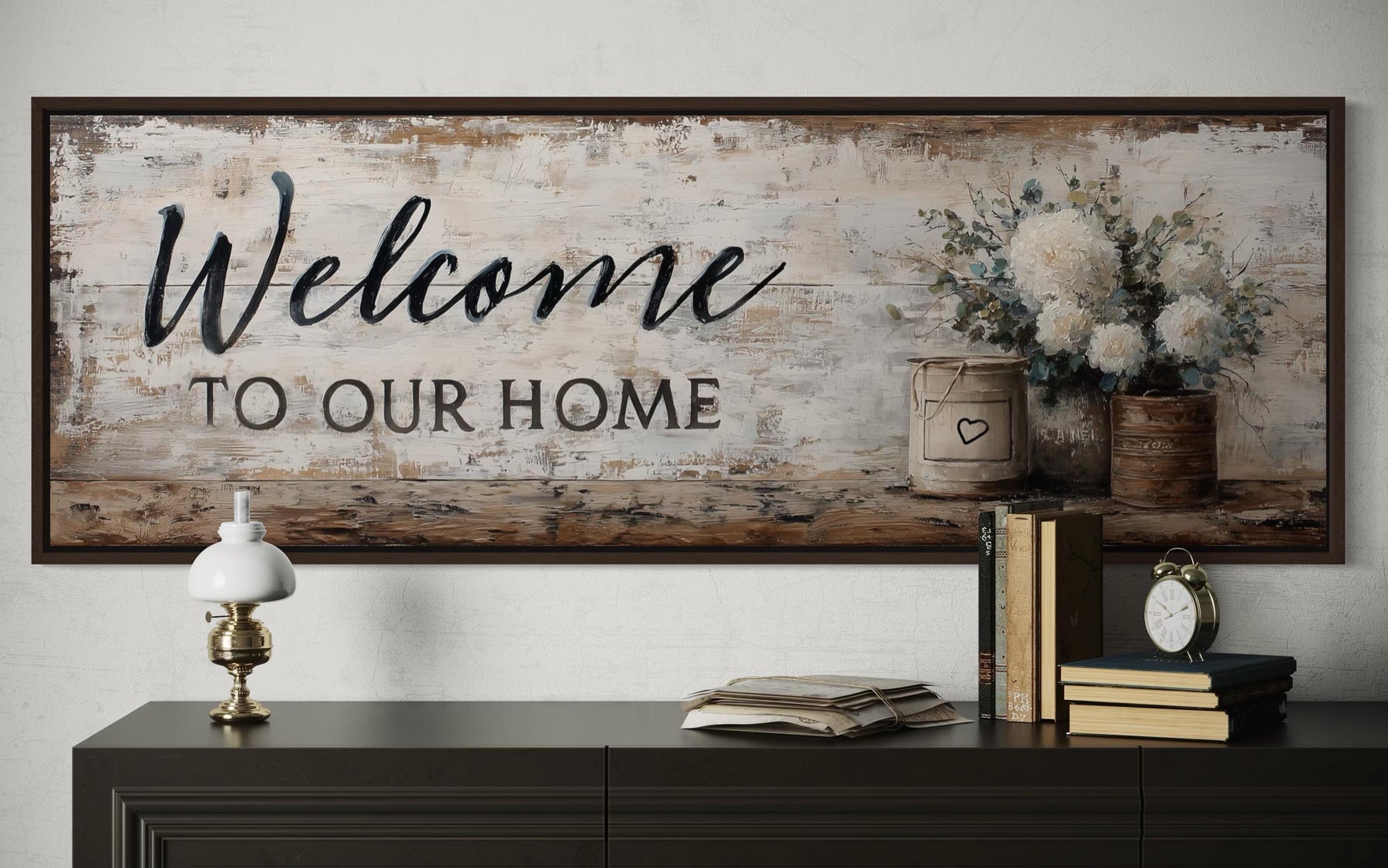 Unser längliches, horizontales Kunstwerk „Willkommen in unserem Zuhause“ ist perfekt für Wohnzimmer im Landhausstil und gemütliche Eingangsbereiche, wo eine warme, einladende Atmosphäre den Ton für das gesamte Haus angibt. In einem Wohnzimmer im Landhausstil harmoniert die sanfte, neutrale Farbpalette wunderbar mit Naturholzmöbeln, Leinenstoffen, geflochtenen Körben und rustikalen Oberflächen. Das längliche, horizontale Format kommt über Sofas, Konsolentischen oder breiten Kaminsimsen hervorragend zur Geltung und lässt das Kunstwerk den Raum großzügig ausfüllen. Im Eingangsbereich schafft dieses einladende Bild einen freundlichen ersten Eindruck für Gäste und passt perfekt zu warmem Licht, grünen Akzenten und schlichter saisonaler Dekoration. Das florale Design verleiht dem Kunstwerk eine sanfte Note und bewahrt gleichzeitig seine elegante und klare Optik – ideal für Häuser, die Wert auf Schlichtheit und Gemütlichkeit legen. Es ergänzt neutrale Interieurs in Weiß-, Beige- und Grautönen sowie natürliche Materialien. Auch Häuser im Übergangsstil profitieren von seiner klaren, warmen Ästhetik, die traditionelle und moderne Elemente harmonisch vereint. Dieses Kunstwerk bringt eine beruhigende Präsenz in die Wohnräume und fördert eine warme und einladende Atmosphäre im ganzen Haus. Es eignet sich für Hausbesitzer, die Kunst mit einer gefühlvollen Botschaft ohne übermäßig dekorative oder farbenfrohe Motive schätzen. Dieses einladende Design verleiht jedem gemütlichen, vom Landhausstil inspirierten Raum mit dem warmen Charme des langen horizontalen Leinwandbildes „Welcome to Our Home“ den letzten Schliff.
