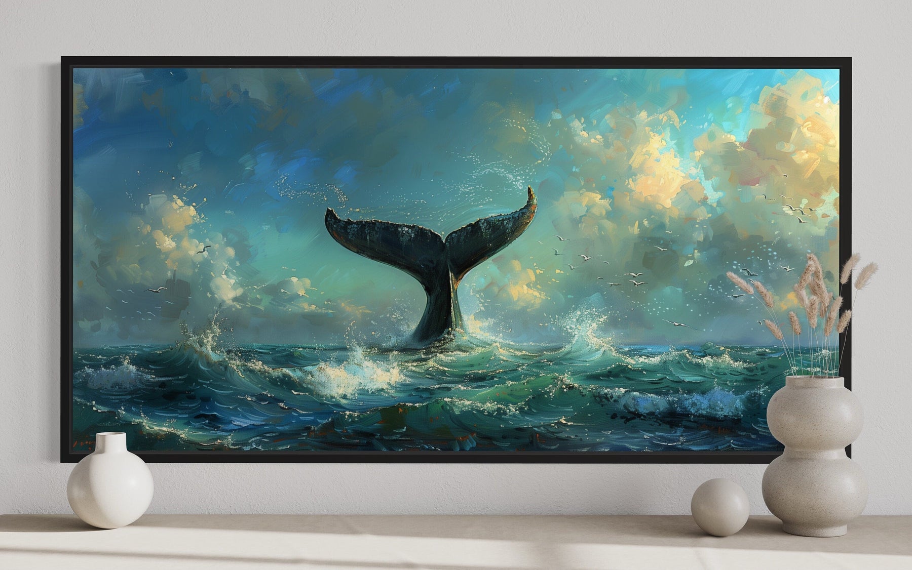 Unser Wandbild auf Leinwand mit einem Walschwanz bringt die beeindruckende Schönheit des Ozeans in Ihr Zuhause. Dieses gerahmte Kunstwerk fängt den majestätischen Moment ein, in dem ein Wal ins Meer taucht und sein mächtiger Schwanz durch das ruhige Wasser bricht. Die detaillierten Pinselstriche erwecken die sanften Wellen des Ozeans und die weichen Verläufe des Himmels zum Leben und schaffen eine ruhige und fesselnde Szene. Dieses Stück ist perfekt für Liebhaber des Meereslebens und nautischer Themen und verleiht Ihrer Einrichtung Eleganz und Abenteuer. Das zeitlose Design macht es zu einem herausragenden Mittelpunkt für strandinspirierte Innenräume oder Räume, die sich nach einer Verbindung zur Natur sehnen. Ob in einem Wohnzimmer, Büro oder einem Rückzugsort an der Küste, dieses Kunstwerk verwandelt Ihren Raum in eine Oase der Ruhe. Sein raffiniertes nautisches Thema stellt sicher, dass es eine Vielzahl moderner und klassischer Stile ergänzt. Tauchen Sie ein in die Schönheit des Ozeans mit diesem atemberaubenden Wandbild auf Leinwand mit einem Walschwanz.