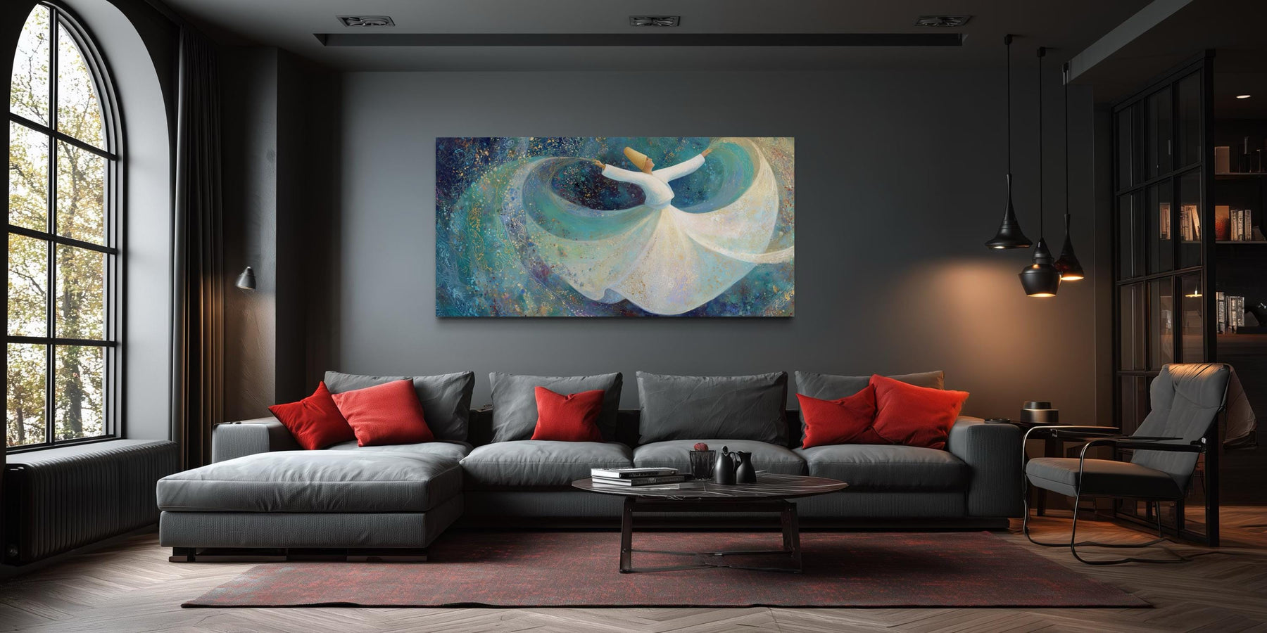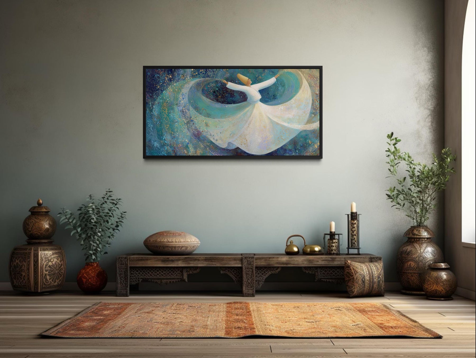 Dieses Wandbild eines wirbelnden Derwischs wurde für Interieurs entworfen, die Ruhe und bewusstes Design in den Vordergrund stellen. Es eignet sich besonders für moderne Zen-Wohnzimmer, in denen dezente Möbel, weiche Textilien und minimalistische Dekoration dem Kunstwerk Raum zur Entfaltung geben. Über einem langen Sofa angebracht, lässt die fließende Bewegung des Tänzers die Wand optisch breiter wirken und erzeugt ein Gefühl von Weite, das offene Raumkonzepte unterstreicht. In Meditationsräumen oder spirituellen Übungsräumen verstärken die symbolische Haltung und die anmutige Bewegung der Figur die Themen Achtsamkeit und Ausgeglichenheit. Die Türkis- und Blautöne harmonieren wunderbar mit neutralen Wänden, Akzenten aus Naturholz und schlichten, modernen Möbeln und schaffen so eine Atmosphäre der Ruhe und Ausgeglichenheit. Dank seiner ruhigen und zugleich ausdrucksstarken Präsenz kommt es in Räumen, die auf Symmetrie und sanftes Umgebungslicht setzen, besonders gut zur Geltung und verzichtet auf überladene Dekorationen. Durch seine horizontale Form kann es eine Akzentwand ohne weitere Kunstwerke strukturieren und sorgt so für ein fokussiertes und stimmiges Gesamtbild. Die spirituelle Symbolik verleiht Interieurs, die Wert auf Bedeutung und kulturellen Ausdruck legen, mehr Tiefe als trendorientierte Dekoration. Der moderne, abstrakte Hintergrund harmoniert perfekt mit minimalistischer Einrichtung, die durch ihre subtile Textur und klare architektonische Linien besticht. Dieses Kunstwerk eignet sich für Räume, die zum Nachdenken und zur Ruhe einladen, anstatt für laute, gesellige Treffen. Die Gesamtwirkung ist harmonisch, besinnlich und optisch weitläufig – maßgeblich geprägt durch das Leinwandbild „Wirbelnder Derwisch“.