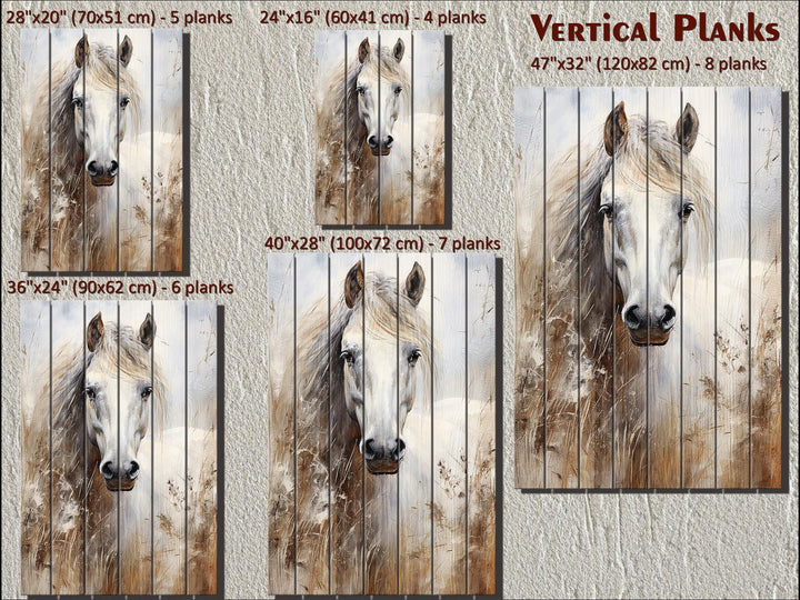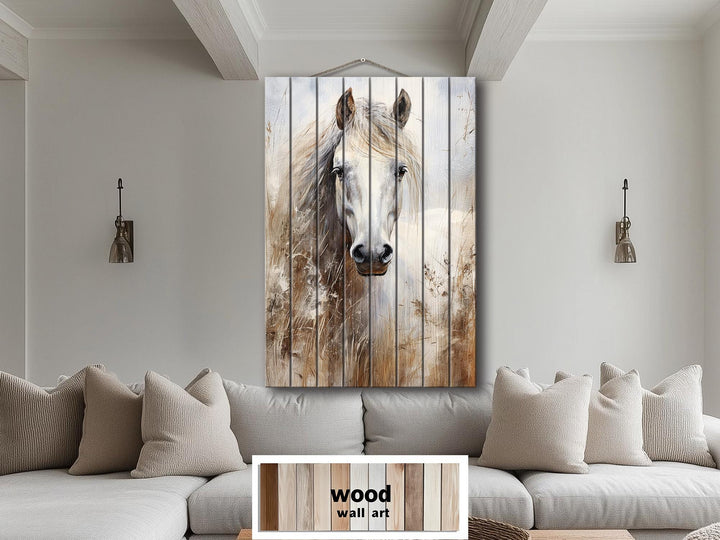 Dezente Neutral- und Erdtöne dominieren dieses Gemälde eines weißen Pferdes und verstärken seine beruhigende und geerdete Wirkung. Das weiße Fell des Pferdes weist zarte Schattierungen in sanften Grau- und Sandbeigetönen auf, die seiner Mähne und seinem Körper Tiefe verleihen, ohne die natürliche Maserung des Holzes dahinter zu überdecken. Die verwitterte Holzoberfläche bietet Schichten aus verwittertem Weiß, staubigem Braun und abgenutzten Grautönen, die optische Struktur und Wärme erzeugen. Subtile Kontraste zwischen den kühleren Grautönen und den wärmeren, fast goldenen Untertönen verleihen dem gesamten Werk eine ausgewogene und beruhigende Wirkung. Diese Palette lässt sich mühelos mit anderen neutralen Tönen wie Elfenbein, Haferflocken oder sanftem Mokka kombinieren und ist somit eine flexible und dennoch charaktervolle Ergänzung für rustikale Inneneinrichtungen. Der Hintergrund ist nicht flach, sondern voller Struktur und Charakter, wodurch das gesamte Kunstwerk organisch und lebendig wirkt. Der Gesamteindruck ist gedämpfte Eleganz – friedlich, aber nie langweilig – perfekt für Räume, die dezente Details gegenüber grellen Farben bevorzugen. Diese sanfte Harmonie aus warmen Holztönen und weichen Tönen eines weißen Pferdes definiert die natürliche Schönheit unseres Gemäldes eines weißen Pferdes.