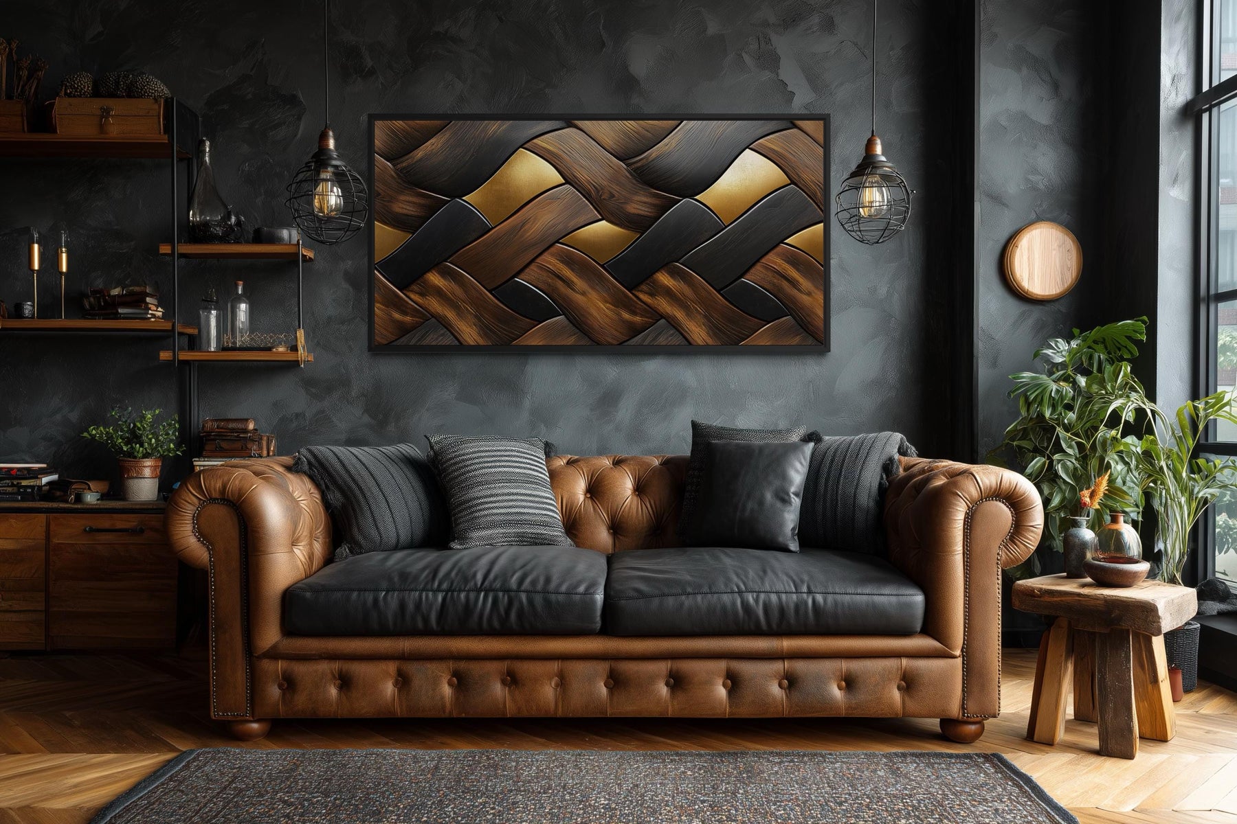 This artwork is best suited for modern masculine living rooms and man cave interiors where structure, texture, and bold design are central to the space. In a masculine living room, the horizontal layout works perfectly above a sofa, console, or media unit, visually anchoring the room and adding architectural interest. The wood-inspired geometry pairs naturally with leather seating, dark wood furniture, concrete walls, and metal accents. In a man cave setting, the abstract design adds sophistication without losing strength, making the space feel intentional rather than cluttered. The muted, earthy tones allow the artwork to stand out without overpowering other elements in the room. This piece works especially well in interiors that favor clean lines, low lighting, and layered textures. It is not designed for light, decorative, or casual spaces, as its strength lies in its structured and grounded presence. The artwork complements spaces where form and material matter more than ornament. Its horizontal scale enhances wide walls and creates balance in larger rooms. This piece completes a strong interior statement as Abstract Wood wall decor.