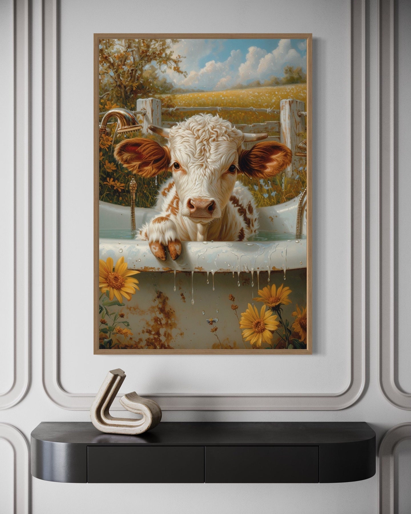 Our baby highland cow calf in the bathtub canvas wall art is an irresistibly charming piece that brings a blend of rustic charm and whimsical fun to your home. This artwork features an adorable baby highland cow enjoying a cozy bath in a vintage-style tub, detailed with fluffy fur and gentle expressions that exude warmth. The lifelike detailing captures the playful innocence of the calf, making it a heartwarming addition to any room. The scene's quaint and cozy composition is perfect for adding a touch of farmhouse flair or a whimsical vibe to nurseries and family spaces. As a high-quality canvas print, it boasts vibrant colors and enduring textures that ensure longevity and visual appeal. Ideal for animal lovers or those seeking unique wall art, this piece strikes the perfect balance between rustic and lighthearted decor. Create a warm and inviting atmosphere with this delightful baby highland cow in the bathtub painting.