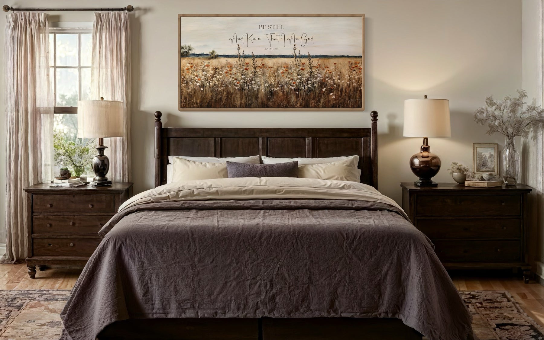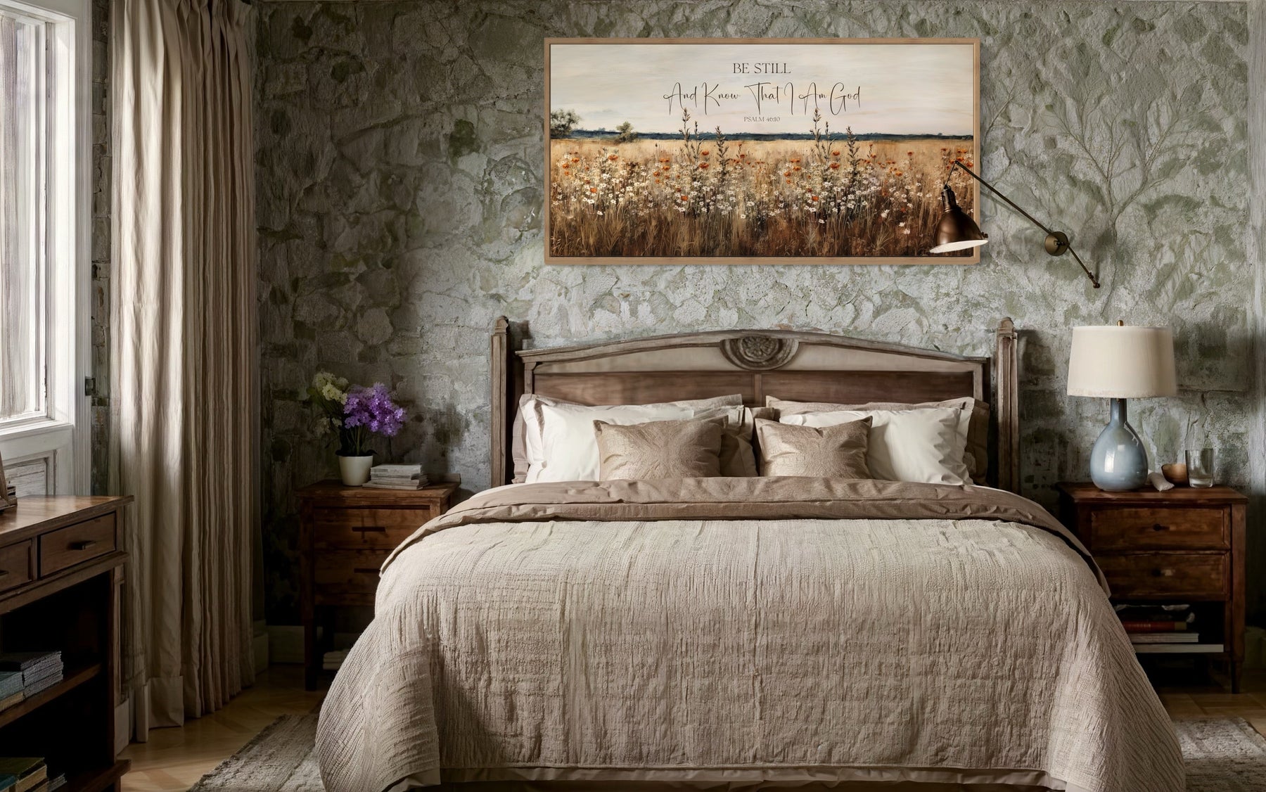Perfect for farmhouse, rustic, and nature-inspired home styles, this Be Still And Know That I Am God wall art brings both spiritual peace and the beauty of wildflowers into your decor. Its gentle tones and floral background make it a wonderful addition to bedrooms, living rooms, or spaces dedicated to reflection and prayer. Hang it above a bed to foster a calming and serene environment that supports relaxation and faith. In a living room, it serves as an inspiring focal point, subtly enhancing the room’s warmth and coziness. The wildflower theme offers a touch of nature, adding vibrancy to the scripture’s comforting message. Its timeless appeal makes it a meaningful gift or a cherished piece in any faith-centered home. This scripture wall art serves as a daily reminder to pause, reflect, and find peace in God's presence amid life's busyness.