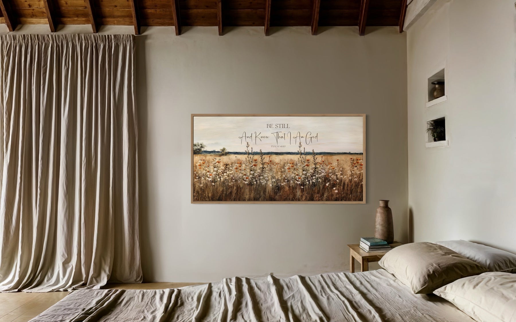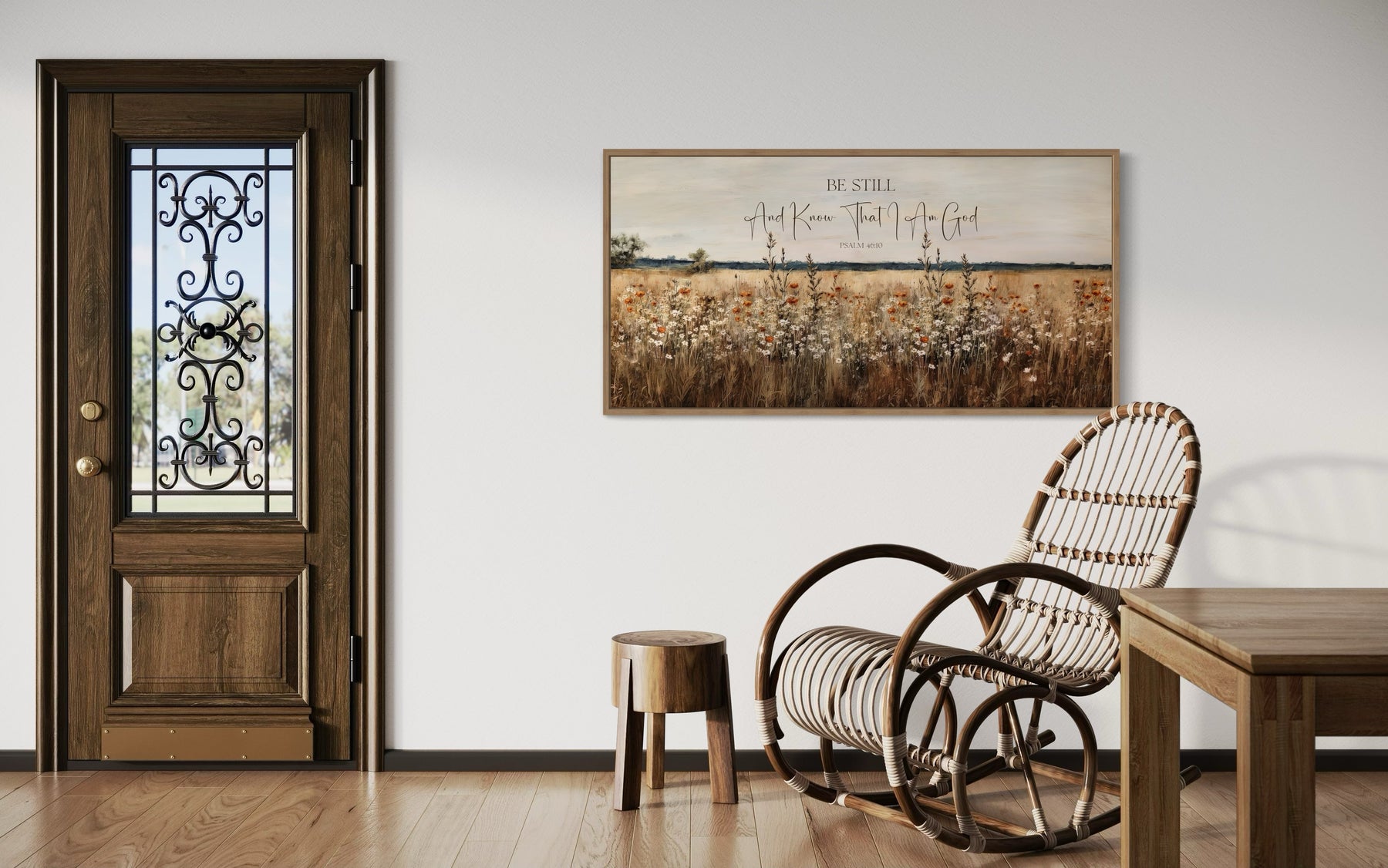 Bring peace and natural beauty into your home with this Be Still And Know That I Am God farmhouse-style canvas wall art, inspired by the comforting words of Psalm 46:10. Set against a serene field of wildflowers, this artwork combines rustic charm with a spiritual message that encourages calm and reflection. The gentle flowers provide an earthy backdrop, symbolizing growth, peace, and the beauty of God's creation. The script flows gracefully across the floral field, adding a soft elegance to the scene. Ideal for those who find tranquility in both nature and faith, this piece brings the serenity of the outdoors into your home. Display it above a bed, mantel, or sofa to create a warm, inviting atmosphere that fosters stillness and contemplation. This wall art is both a reminder of divine presence and a celebration of the natural world.
