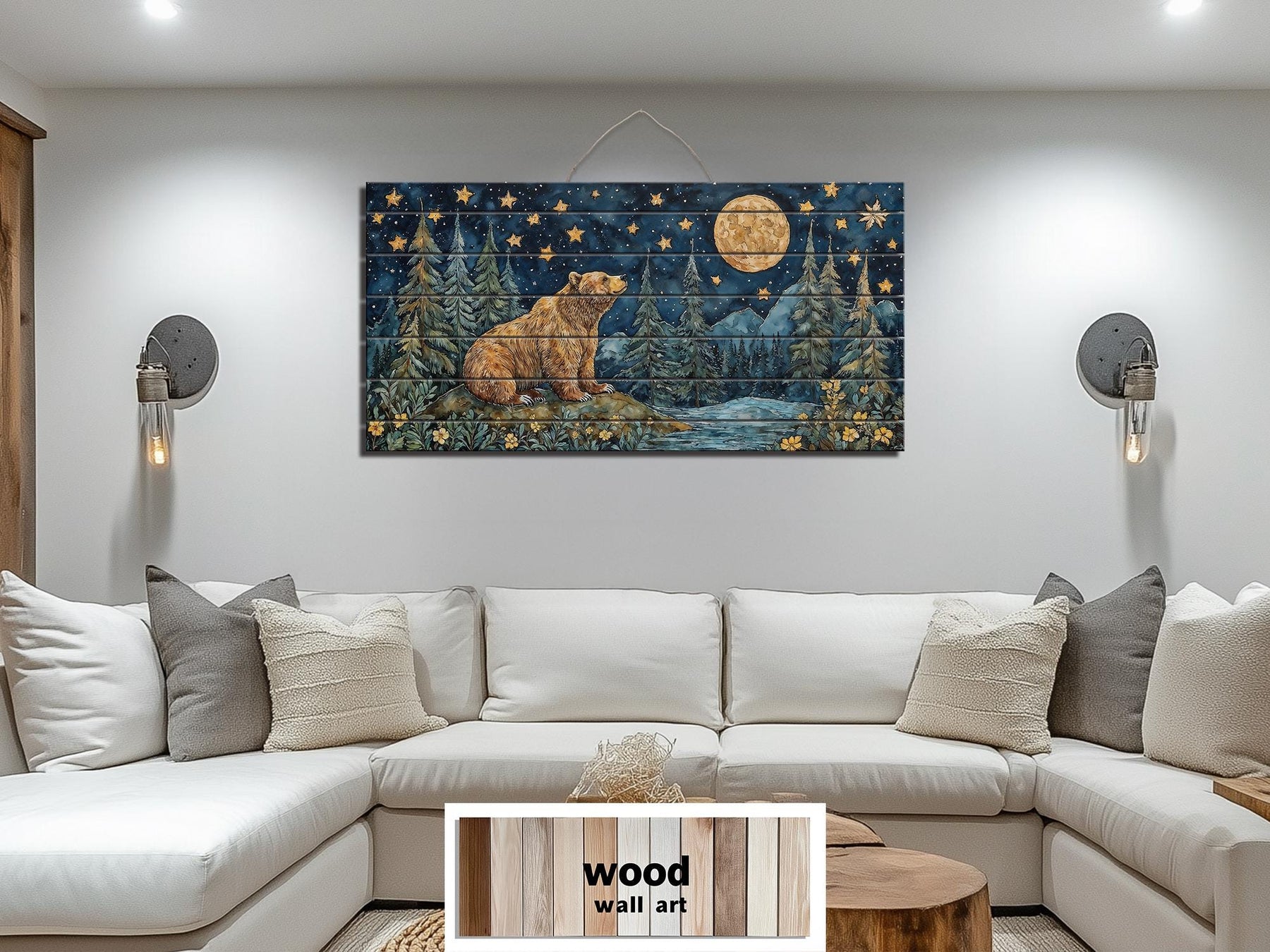 This Bear Under Full Moon At Night wood wall art is designed for cabin living rooms or lodge-style man caves where natural materials and wilderness themes shape the entire space. It belongs above a stone fireplace, behind a leather sofa, or along a reclaimed wood feature wall where its wide format can fully expand. In log homes with exposed beams, wool blankets, and iron lighting, the artwork becomes an instant focal point that reinforces the outdoor lifestyle. The solid new wood panel construction makes it feel substantial and permanent rather than decorative. It also fits perfectly in mountain retreats, hunting lodges, or lake cabins where wildlife imagery reflects personal passion for nature. This is not intended for bright modern interiors—it thrives in warm, textured rooms filled with history and character. Mounted in a dedicated gathering space, it adds depth, storytelling, and a strong visual anchor. The glowing moon and moving bear create an evening atmosphere even during the day. Paired with vintage gear, lantern lighting, and natural fabrics, it completes a cohesive rustic environment. Define your wilderness-inspired retreat with this Bear Under Full Moon At Night wood wall art distressed wood wall art.