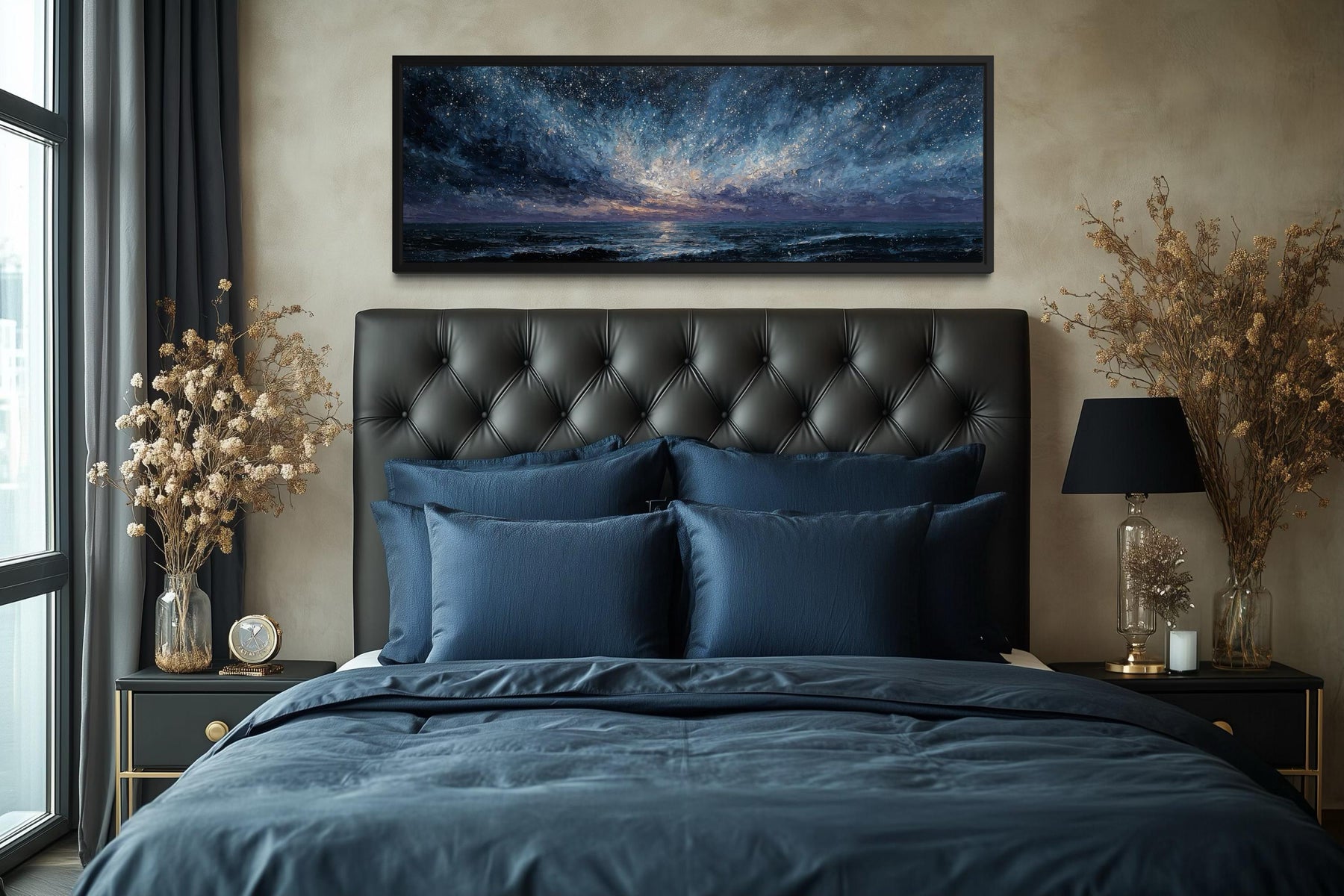 Our modern bedroom wall art is specifically suited for bedrooms and intimate living spaces where mood and atmosphere matter more than decoration. This piece works beautifully above a bed, where the panoramic format mirrors the width of the headboard and creates a strong focal point. It pairs naturally with dark bedding, textured fabrics, and minimalist furniture that allows the artwork to command attention. The moody color palette supports restful environments while still offering visual interest and depth. This artwork is ideal for modern bedrooms that lean toward calm, dramatic, or contemporary styling rather than bright or playful décor. It also works well in low-light spaces where its darker tones enhance the room’s ambiance. Rather than adapting to every interior style, this piece confidently supports spaces designed for quiet reflection and relaxation. The absence of literal imagery makes it versatile without feeling generic. It adds emotional weight without visual noise. The final impression is immersive and refined, anchored by moody seascape canvas wall art.