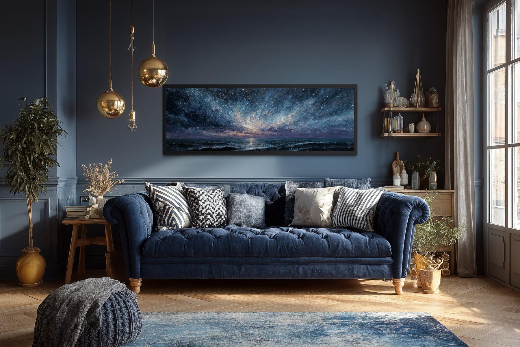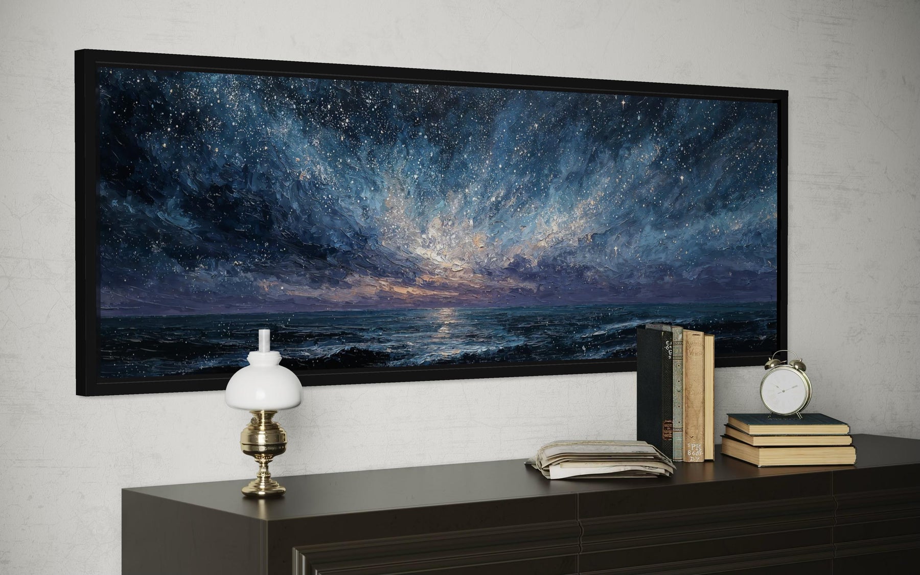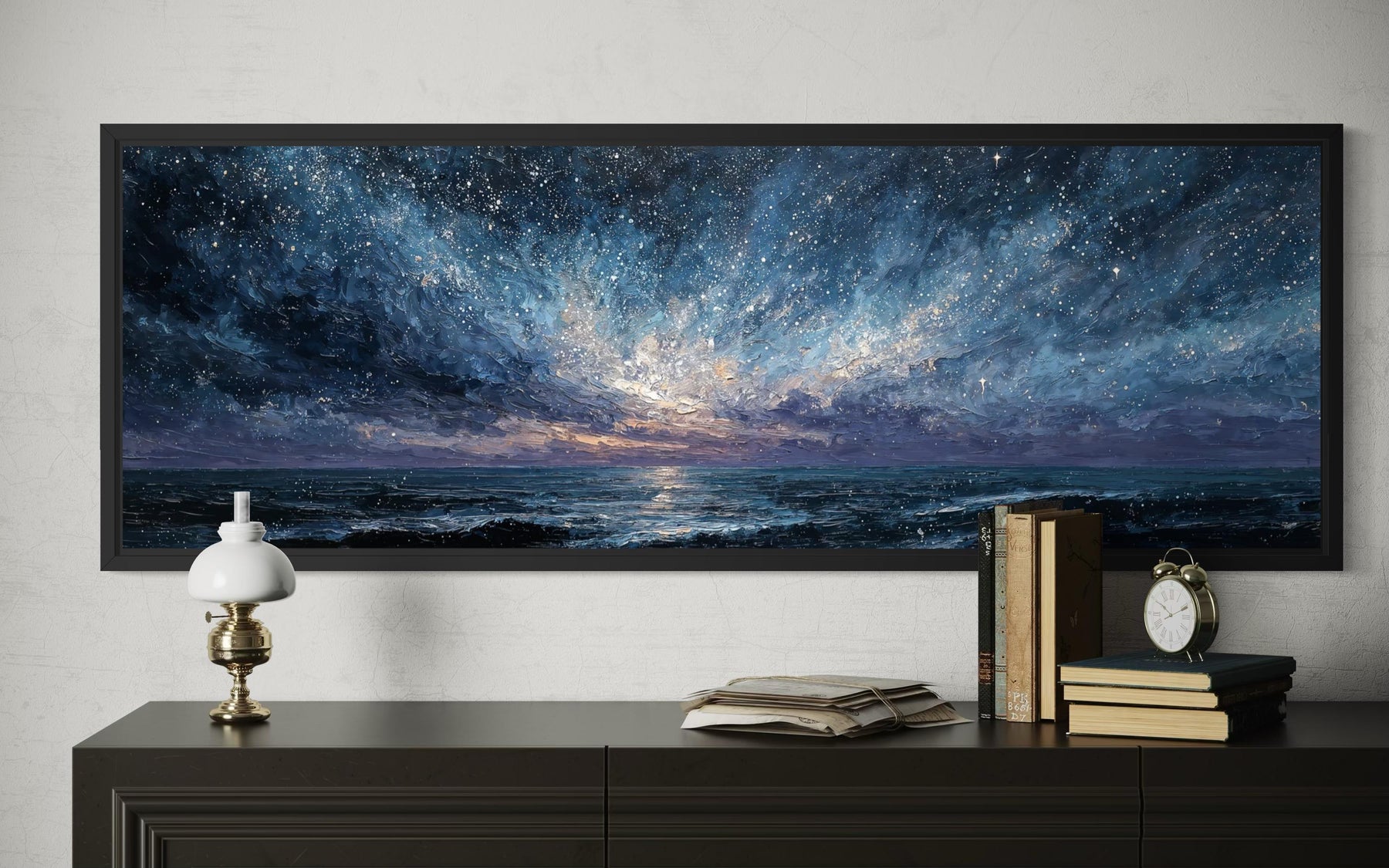 Our blue navy purple wall art canvas print is a wide panoramic seascape painting that captures an expansive ocean scene under a dramatic, atmospheric sky filled with motion and depth. The composition stretches horizontally, allowing waves, horizon, and sky to flow naturally across the canvas without interruption. The ocean surface is textured with layered brushwork, giving the water movement and weight rather than a flat or minimal appearance. Above the water, the sky unfolds in sweeping tones of navy, deep blue, and muted purple, creating a moody and immersive visual experience. Light appears to break subtly through the clouds near the horizon, adding contrast and emotional focus without turning the scene bright or serene. The painting style leans modern and expressive, blending realism with abstract softness rather than sharp detail. This artwork is designed to feel cinematic and enveloping, drawing the viewer into the scene rather than sitting quietly in the background. The panoramic format enhances the sense of scale, making the seascape feel expansive and grounding. There are no boats, people, or landmarks, allowing the focus to remain entirely on atmosphere and movement. The overall presence is dramatic, calm, and introspective, clearly defining the identity of blue navy purple wall art.