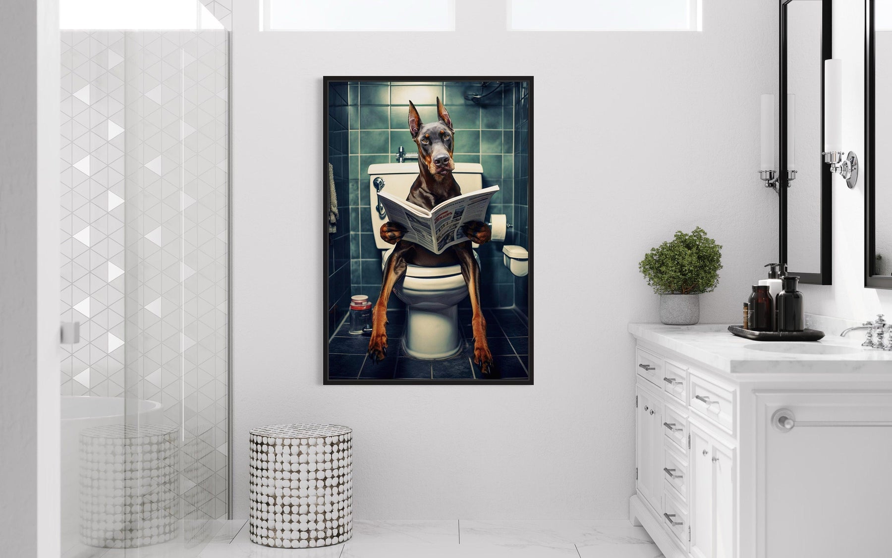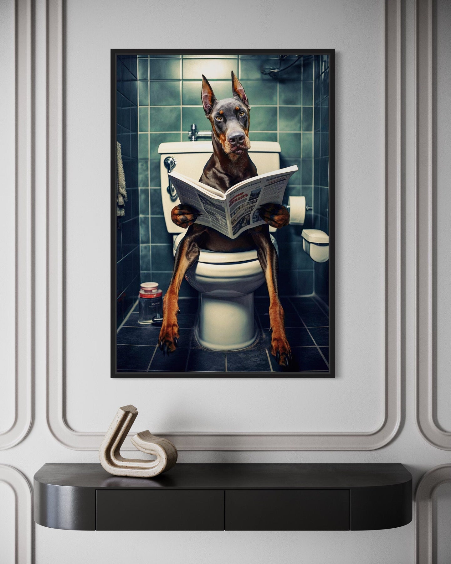 This Brown Dobermann on toilet captures a blend of humor and style, featuring a dignified Dobermann sitting on a toilet while casually reading a newspaper. The playful yet composed scene is brought to life through meticulous detail, from the Dobermann’s attentive expression to the folds of the newspaper. Designed as a high-quality canvas print, this piece offers a sleek and polished finish that’s built to last. The humorous concept is elevated by the Dobermann’s natural elegance, making it a delightful centerpiece for your bathroom decor. Its distinct combination of whimsy and sophistication ensures it will catch the eye of guests and spark conversations. Perfect for adding a fun twist to a functional space, this wall art is as charming as it is unique. Whether for your home or as a memorable gift for a dog lover, it’s a design that stands out.