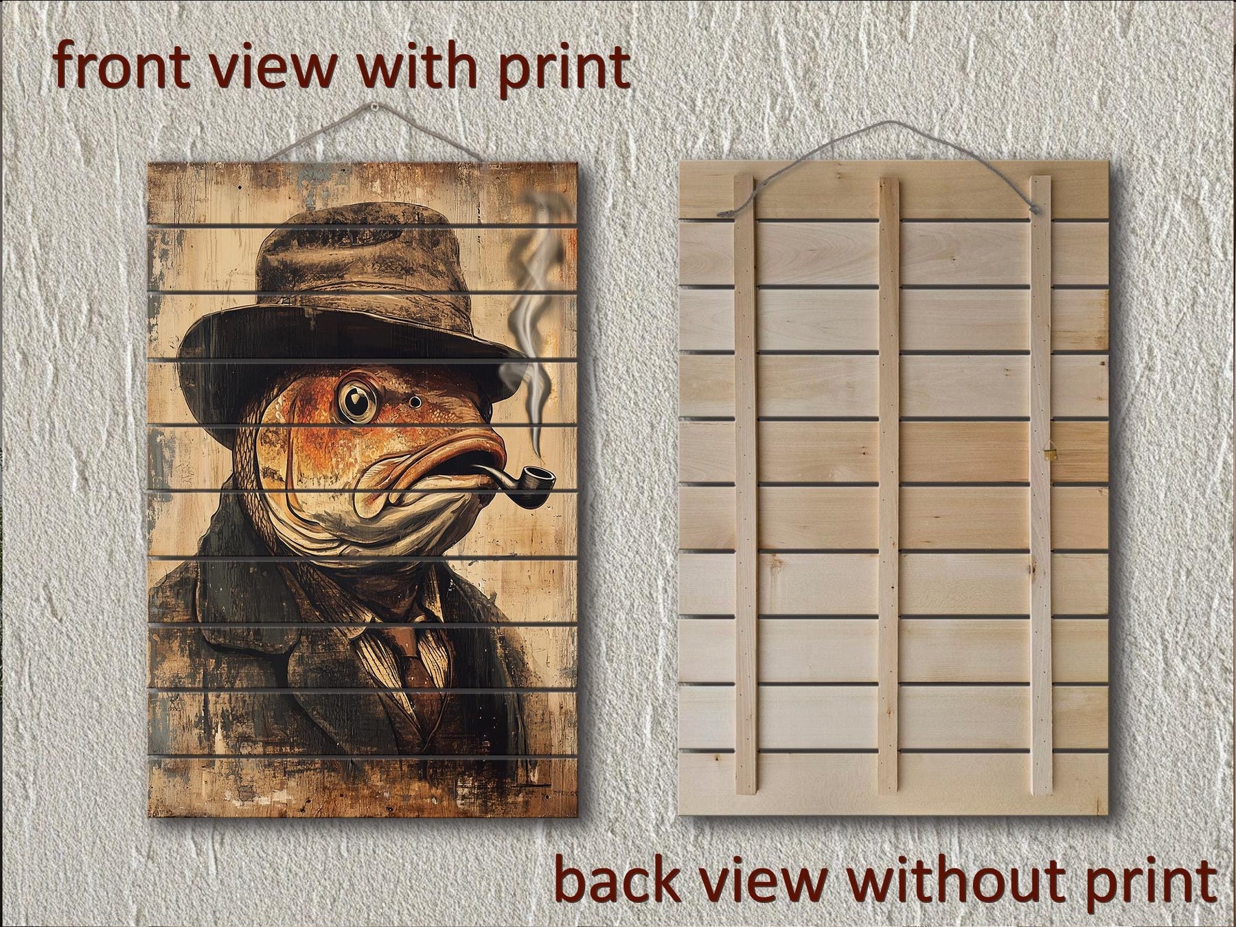 Distressed wood wall art featuring a carp in a hat smoking a pipe, shown from front and back.