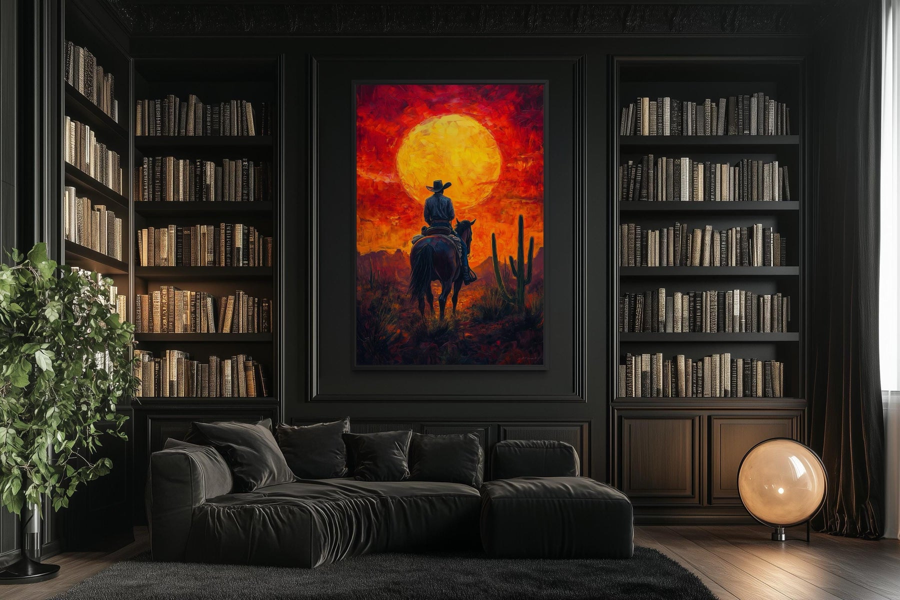 Our Cowboy canvas wall art is a canvas print that depicts a lone cowboy seated on horseback, silhouetted against an immense fiery desert sunset that fills the entire composition with dramatic heat and atmosphere, creating a scene that feels cinematic, powerful, and unmistakably Western in spirit, where the rider’s stillness contrasts with the burning sky behind him. The cowboy is positioned slightly off center, allowing the blazing sun to dominate the background, its deep reds, molten oranges, and scorched ambers radiating outward and casting the figure into a strong, masculine silhouette that immediately draws the eye. The horse stands calmly beneath the rider, reinforcing themes of control, resilience, and quiet strength, while sparse desert vegetation and subtle ground textures anchor the scene in a harsh, open landscape. The painting style blends rustic realism with a slightly abstract treatment of light and sky, where the sunset appears almost painted with broad, expressive strokes rather than photographic precision. There is a sense of heat in the air, as if the desert day has reached its final, most intense moment before nightfall, making the scene feel alive rather than static. The background sky feels expansive and overwhelming, dwarfing the human figure and emphasizing the scale and isolation often associated with Western life. This artwork does not rely on excessive detail but instead uses contrast, light, and silhouette to tell a story that feels timeless and rugged. The overall effect is bold, dramatic, and intentionally composed to function as a statement Cowboy wall art.