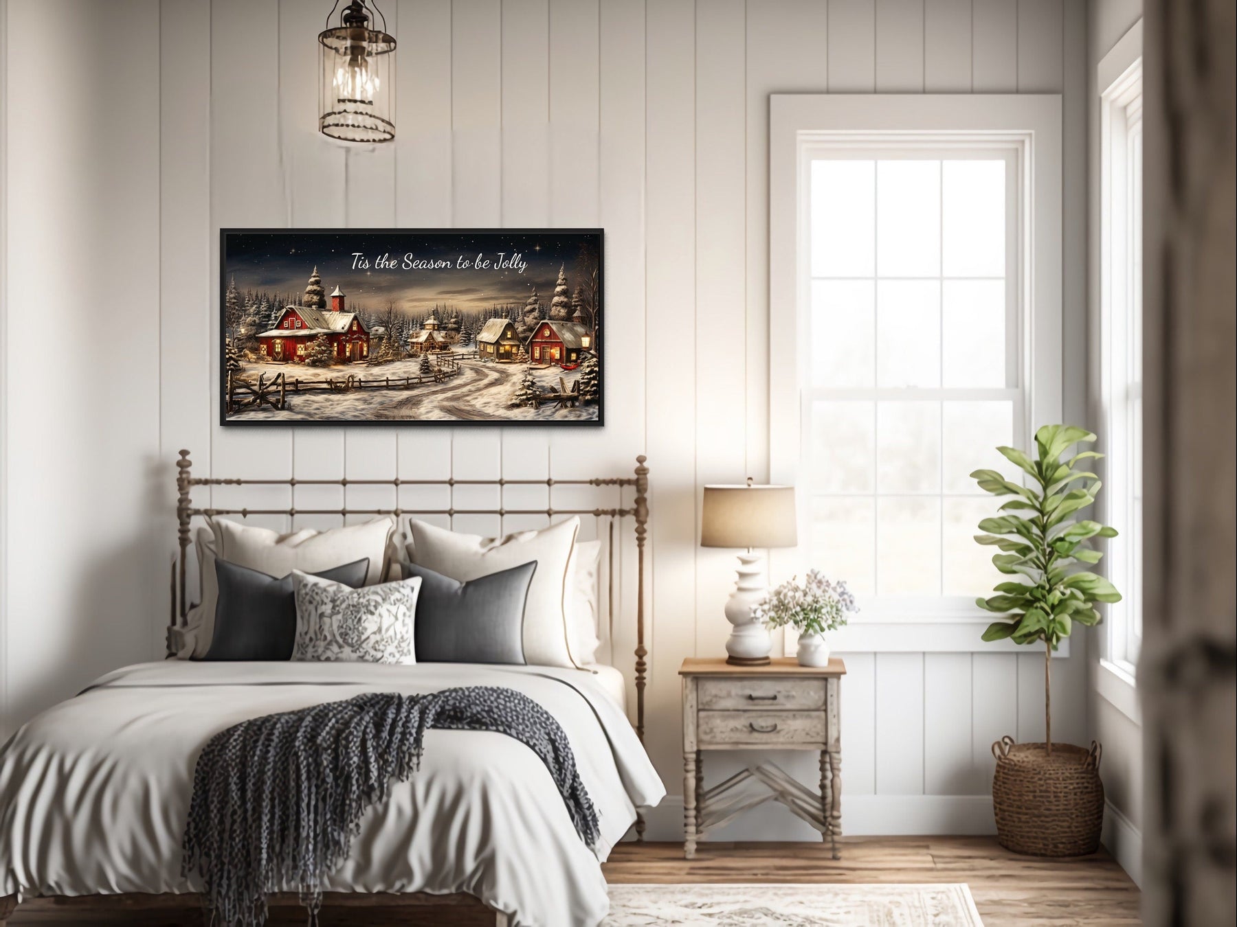 Celebrate the magic of Christmas with this enchanting Christmas Eve wall art. Featuring the heartfelt message "Tis The Season To Be Jolly," this artwork captures a serene snow-covered farmhouse scene adorned with twinkling lights and festive charm. The idyllic setting, complete with cozy cottages blanketed in snow and a glowing Christmas tree, radiates warmth and nostalgia. Ideal for your mantel or as a seasonal focal point, this wall art invites you to embrace the joy and beauty of the holiday season. Each detail, from the delicate snowflakes to the illuminated windows, evokes the peaceful spirit of Christmas Eve. Crafted on premium canvas, this piece ensures vibrant colors and exceptional durability. Whether you're hosting a holiday gathering or simply enjoying the season, this artwork will transform your space into a winter wonderland. Bring the spirit of Christmas to life with this captivating wall art.
