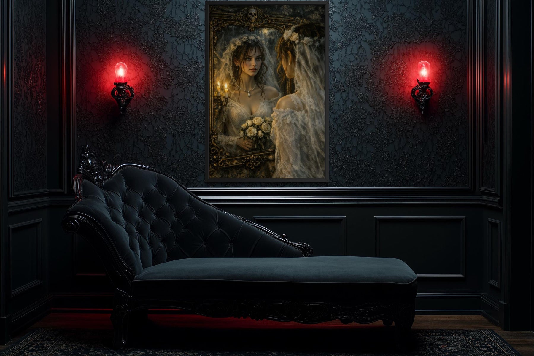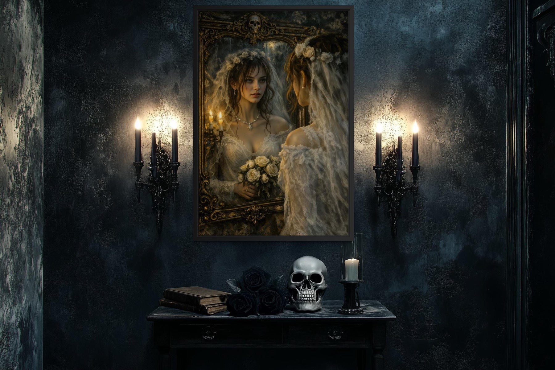 This artwork is designed for gothic libraries and romantic Victorian-inspired interiors where dark elegance and dramatic beauty define the space. The Gothic Bride wall decor fits perfectly in a gothic library, where dark wood, antique furniture, and candlelight create a moody and refined atmosphere. In a Victorian-style room, the portrait feels like an heirloom, adding emotional depth and historical charm to the décor. The vertical format makes it ideal for narrow walls, reading corners, or above antique consoles. The bride’s haunting presence gives the room a strong visual identity. This piece pairs beautifully with dark walls, gold accents, and vintage textures. It brings a sense of story and emotion into the space rather than simple decoration. The artwork feels curated and intentional, not trendy or generic. Both gothic libraries and Victorian rooms benefit from its dramatic character. The Gothic Bride canvas wall art completes the space with romance, mystery, and timeless visual power.