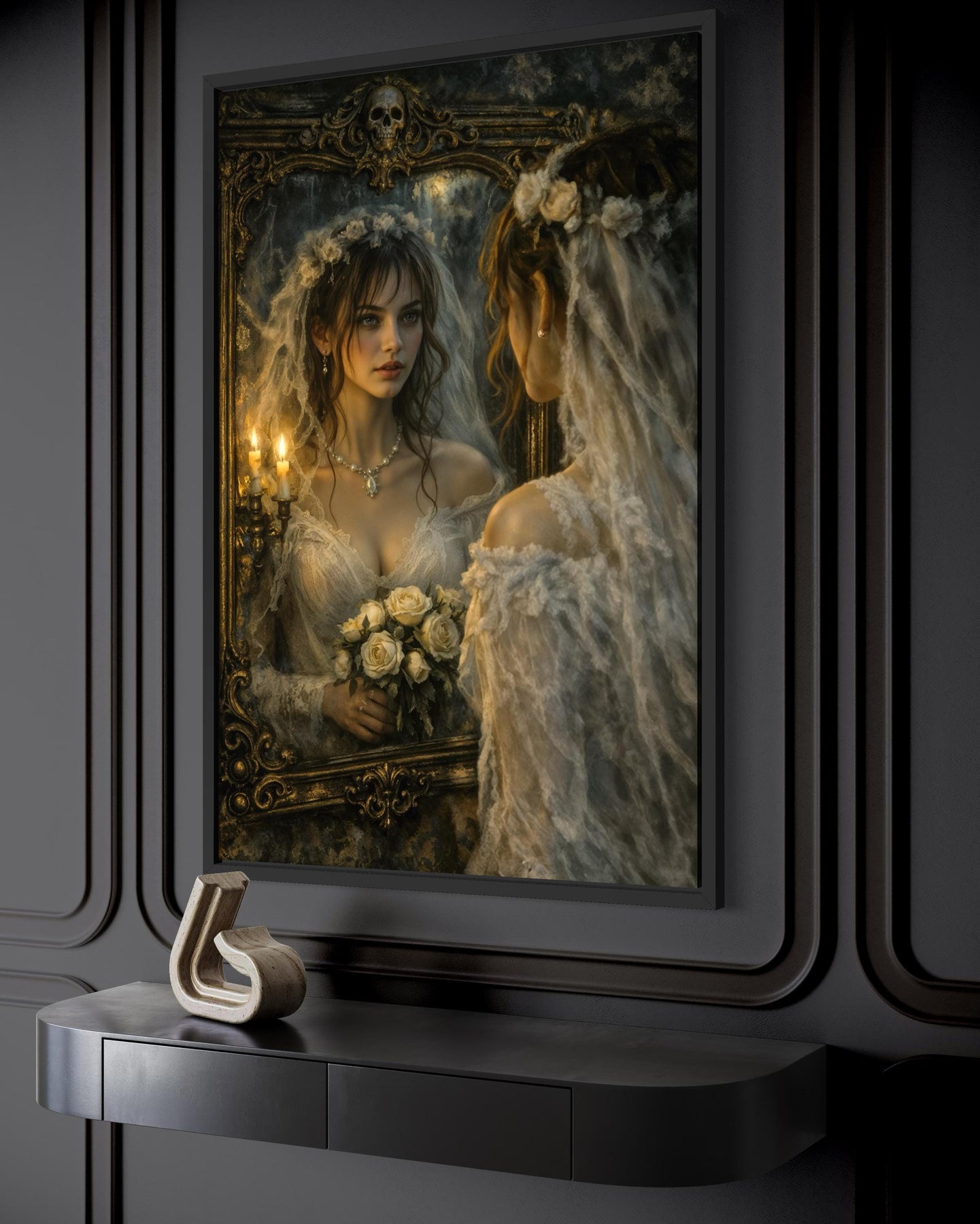 Gothic Bride canvas wall art presents a dark romantic Victorian wedding portrait where a mysterious bride stands softly illuminated by candlelight, her pale face, deep eyes, and delicate veil emerging from rich shadows with haunting elegance. The bride is dressed in an ornate Victorian gown adorned with lace, antique jewelry, and soft floral accents that give the portrait a timeless and dramatic presence. Her expression feels both serene and distant, as if caught between devotion and melancholy, adding emotional depth to the scene. The background is filled with aged textures, dark drapery, and subtle golden light that frames her figure like a relic from another era. The composition feels painterly and cinematic, blending gothic atmosphere with classic portrait styling. The vertical format gives the bride a statuesque presence, making her feel tall and commanding on the wall. Soft highlights on her skin and veil contrast beautifully with the deep shadows around her. This Gothic Bride painting feels romantic, mysterious, and richly detailed. Every element works together to create a portrait that feels both intimate and dramatic. This Gothic Bride wall art turns a simple wall into a darkly elegant focal point.