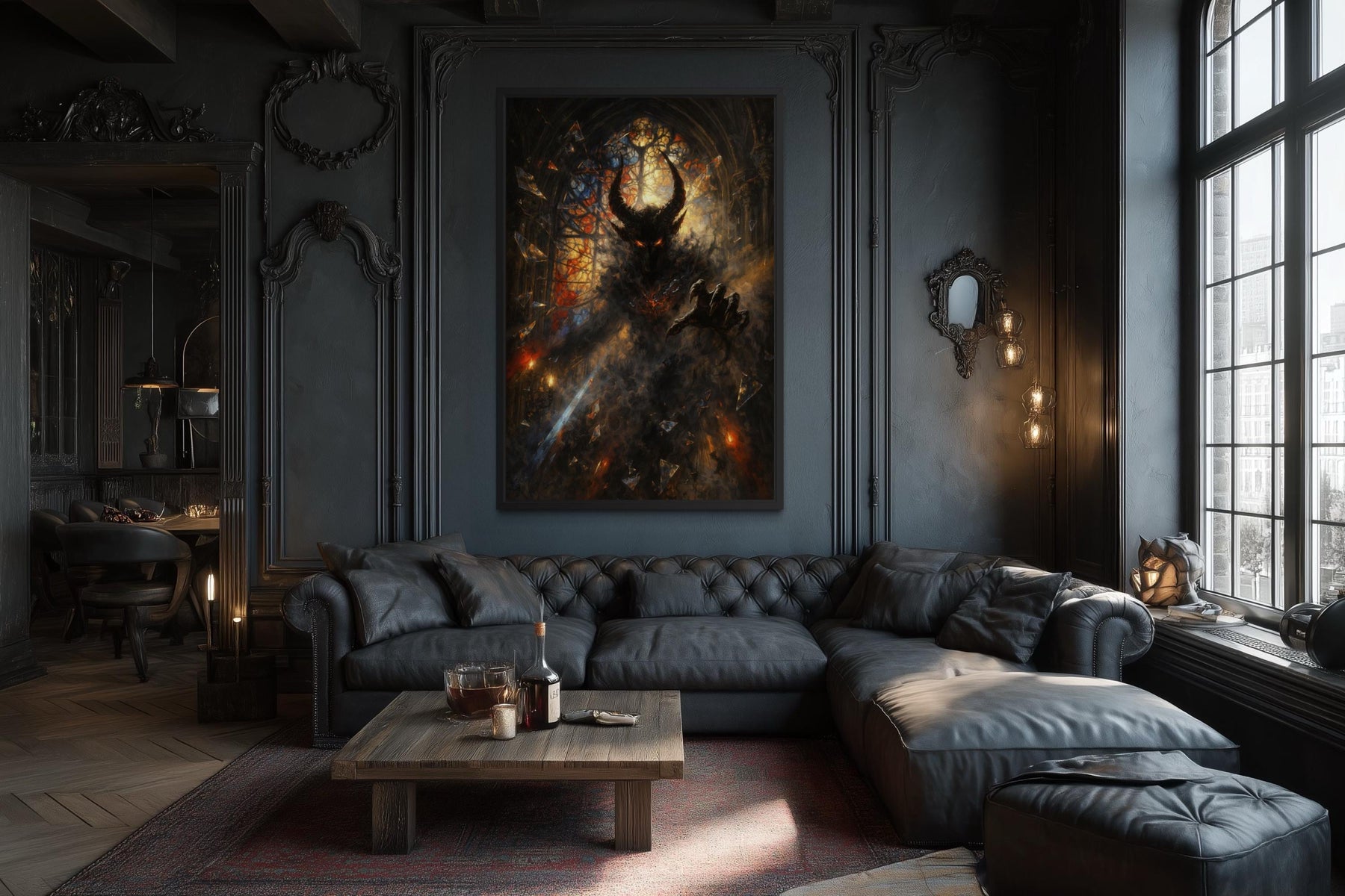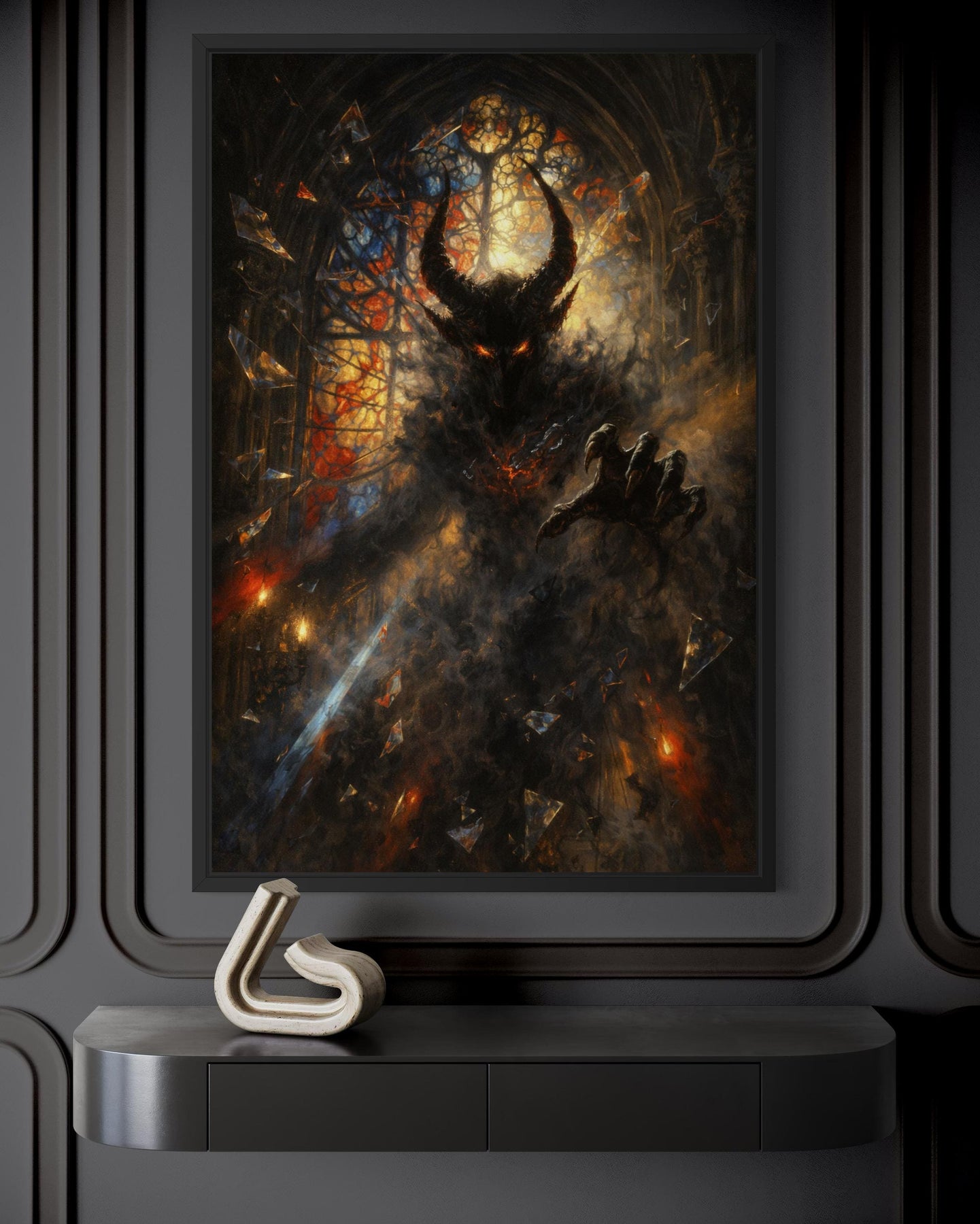Gothic demon wall art featuring a dark fantasy horned creature canvas print in a moody living room.