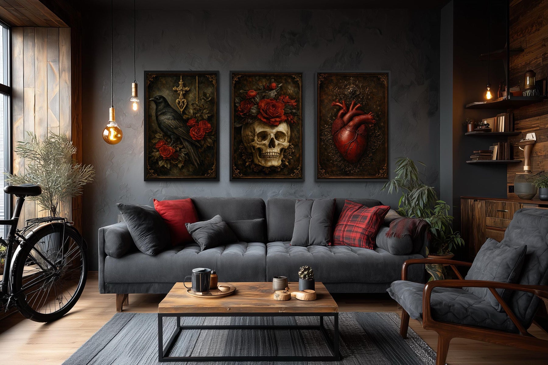 This triptych is designed for gothic libraries and Victorian-inspired interiors where dark elegance and symbolic art define the atmosphere. The Gothic Wall Art Set looks especially powerful in a gothic library, where shelves of old books, leather chairs, and warm lamp light echo the artwork’s mysterious tone. In a Victorian-style room, the three panels feel like treasured pieces collected over time, adding story and depth to the space. The horizontal layout allows the triptych to anchor a wall above a sofa, desk, or sideboard with confidence. Its dark tones pair beautifully with rich woods, brass accents, and deep fabrics. This artwork is meant for people who appreciate moody, meaningful decor rather than light or minimal styles. It brings a sense of drama and quiet intensity to the room. The glowing highlights stand out beautifully in low, warm lighting. Both gothic libraries and Victorian interiors gain a sense of curated sophistication from the set. The Gothic Wall Art Set completes the space with mystery, romance, and timeless gothic character.