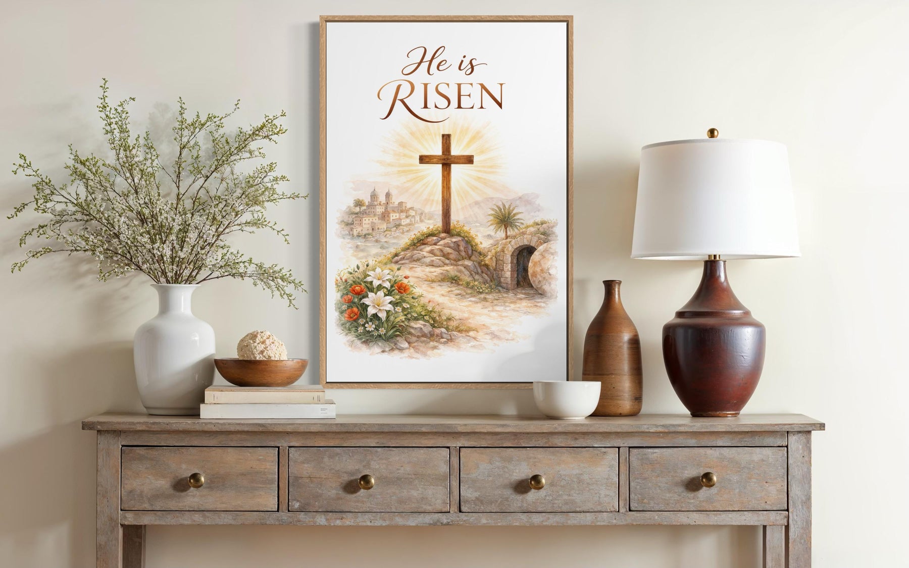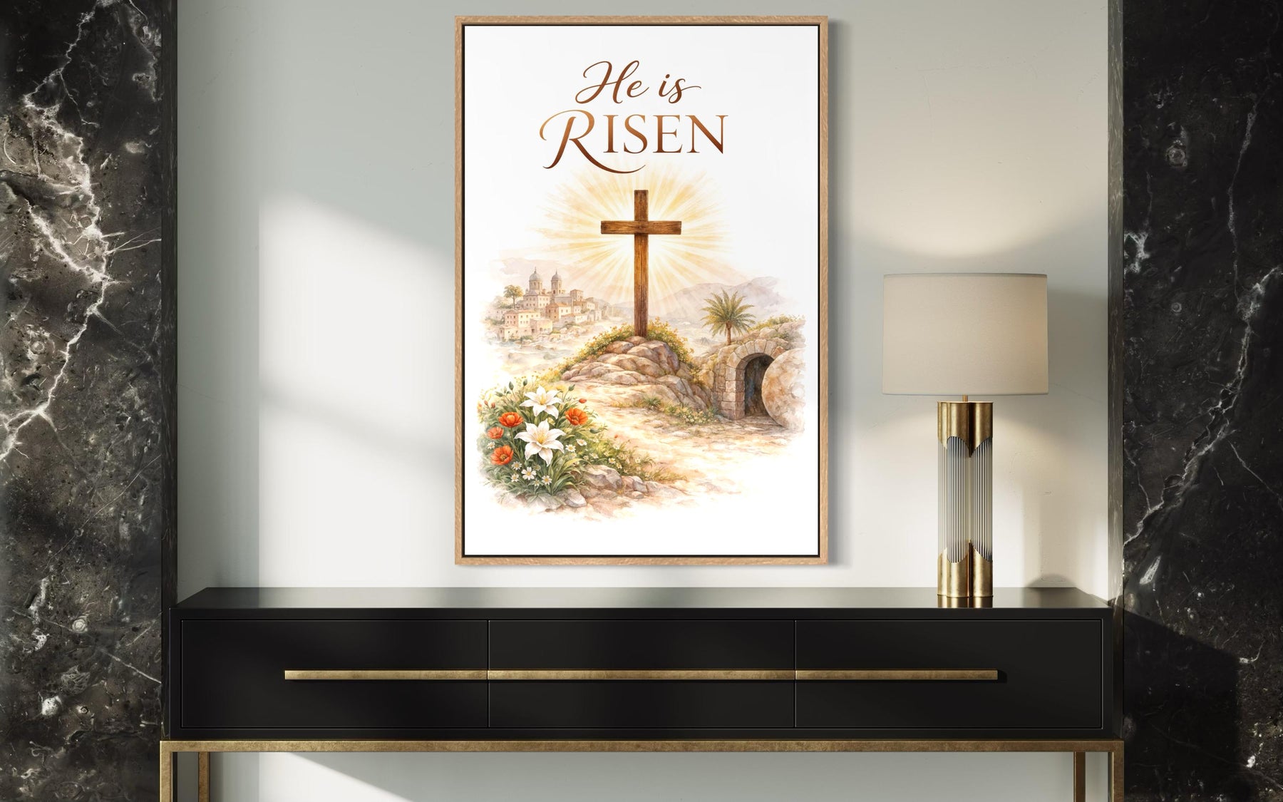 This He Is Risen wall art is a natural fit for Christian homes, faith-based seasonal decor, and peaceful spaces that honor renewal and reflection. In farmhouse interiors, it complements rustic wooden furniture, light cream walls, and natural textures like linen and jute, bringing a soft but meaningful focal point to entryways or living rooms. In transitional or minimalist homes, the muted palette and simple layout make it ideal for adding depth without interrupting clean lines or calm design choices. It can be displayed proudly in Easter decorating setups, set above mantels or near floral arrangements, creating a sacred atmosphere during the season of resurrection. The vertical format makes it especially effective in narrow wall spaces, hallways, or prayer corners, where it serves as a personal reminder of grace and hope. This canvas print also works beautifully in home churches, devotional rooms, and spiritual nooks, adding quiet dignity to places of worship and reflection. Its message is universal yet deeply personal, welcoming believers into a space of light and serenity. The He Is Risen wall art is a moving tribute to the power of faith and a beautiful visual expression of Easter’s meaning.
