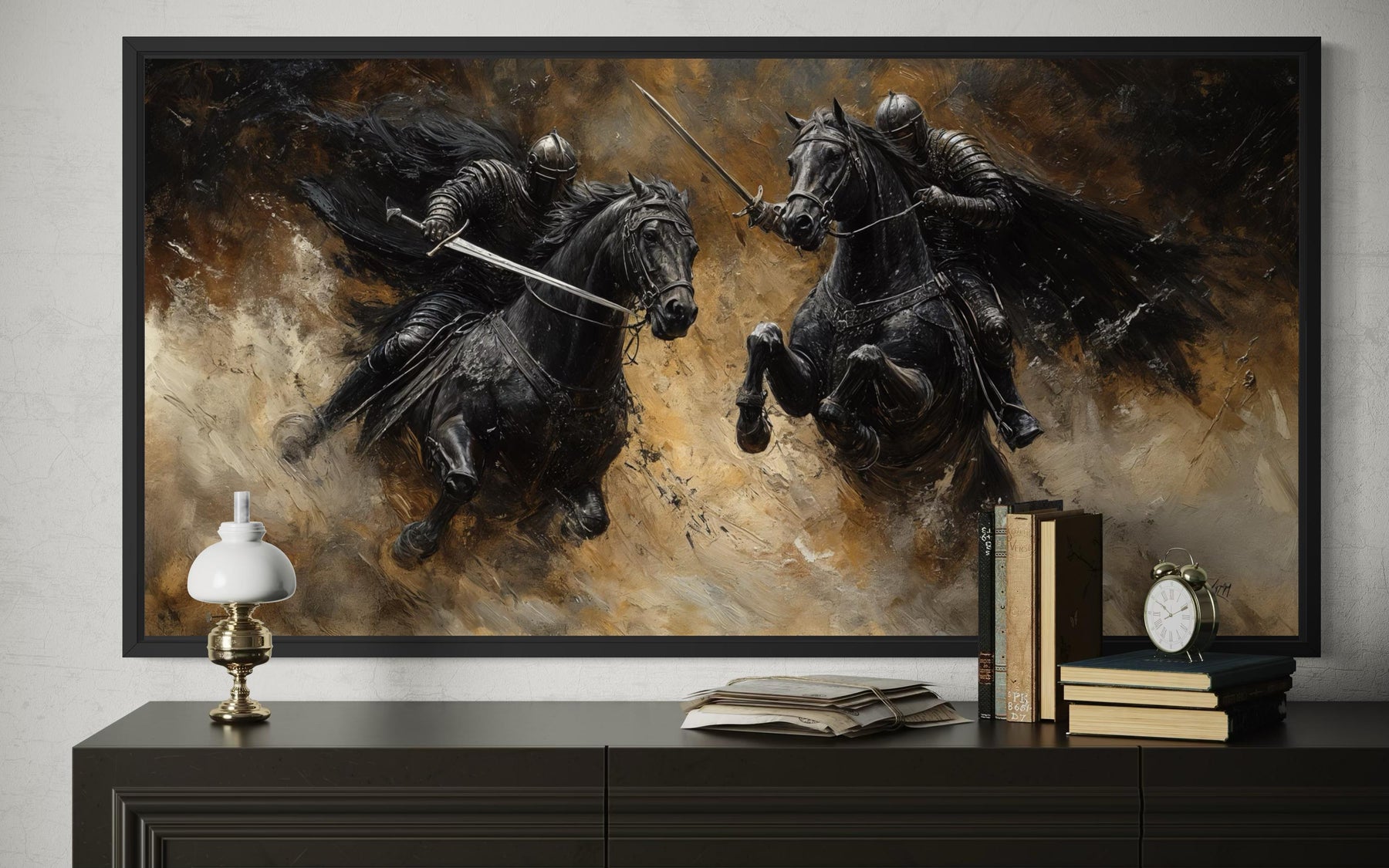 Framed horizontal canvas painting of two medieval knights in a dramatic duel on black horses.