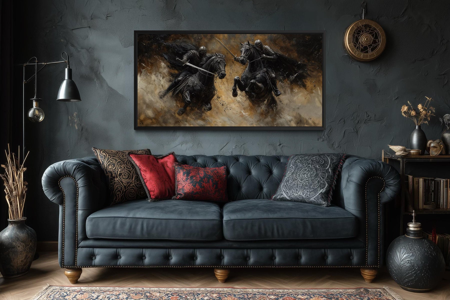 This Medieval knights duel art is created for a man cave where deep leather seating, dark painted walls, and industrial or medieval-inspired decor establish a powerful and immersive environment. Hung above a large sofa or along a feature wall, the horizontal format anchors the room and immediately sets a strong visual identity. The dark palette works perfectly with metal lighting, exposed brick, and heavy wood furniture, reinforcing the atmosphere of strength and heritage. In a home office designed with a moody, masculine aesthetic, the artwork becomes a statement piece that reflects determination and focus. The dramatic lighting within the painting pairs beautifully with warm ambient lamps and creates a gallery-style presentation. This Medieval knights battle wall decor belongs in spaces that embrace bold themes rather than light or casual interiors. Its cinematic scale eliminates the need for multiple smaller pieces and keeps the wall clean and impactful. The historical subject matter adds depth and storytelling to the decor. The room gains intensity and character through the presence of our Medieval knights duel canvas wall art.