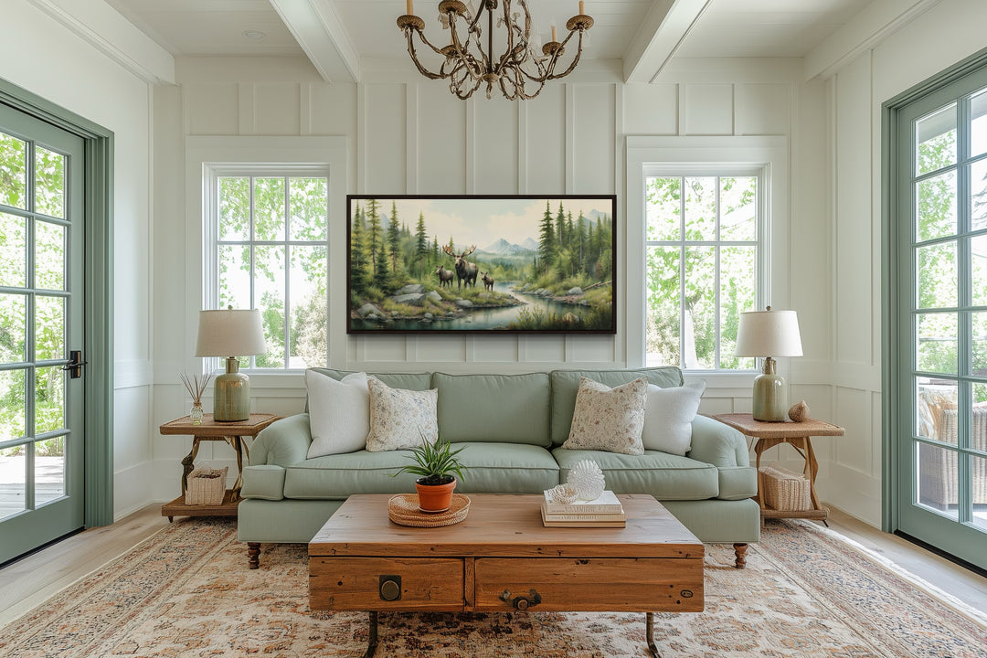 The color palette of this moose painting embraces soft greens, earthy browns, and gentle blue tones that perfectly mirror the calm of a forest landscape. The warm browns of the moose and cubs contrast beautifully with the verdant greens of the surrounding trees, creating a natural harmony. Subtle hues of blue in the distant mountains and sky add depth, while the muted tones provide a soothing backdrop. The blending of these colors brings a peaceful and organic feel to the piece, making it ideal for relaxed and cozy spaces. The balance between light and shadow highlights the intricate details of the animals and the texture of the landscape. These earthy and tranquil shades pair effortlessly with wood accents, neutral walls, or rustic decor themes. This moose canvas print brings a soft and timeless color scheme that enhances any nature-inspired room.