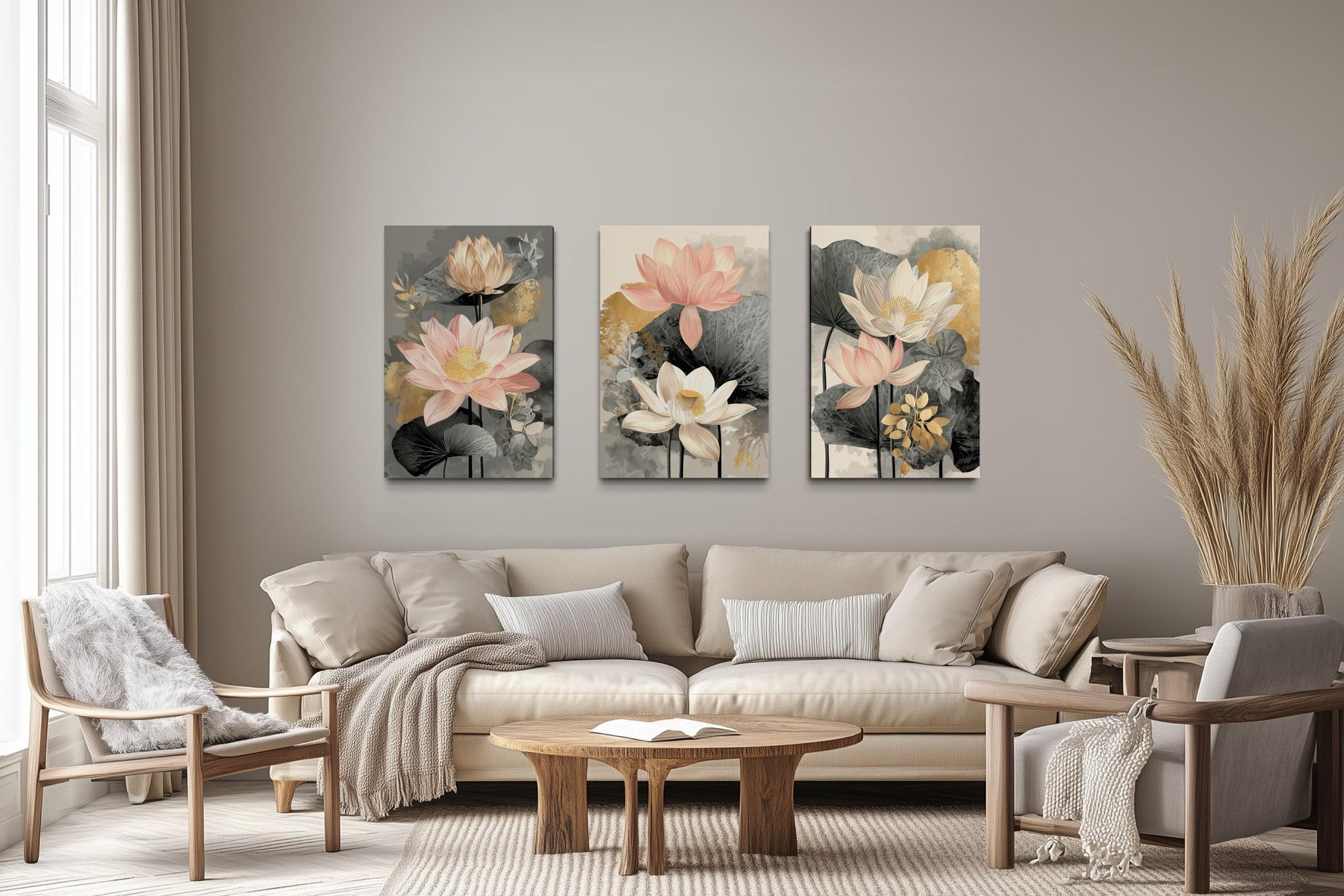 This Neutral Lotus canvas print was created for interiors that embrace calm sophistication and contemporary design, ideally suited for modern living rooms or serene bedrooms. Its restrained elegance aligns effortlessly with minimalist furniture, muted textiles, and airy spaces that emphasize balance and flow. In a modern living room, it serves as a focal point above a neutral sofa or console, echoing tones of beige, blush, and light gold that tie the space together. The floral imagery adds a touch of softness to linear architecture, making the environment more welcoming without sacrificing clean aesthetics. For bedrooms, it enhances a tranquil atmosphere where rest and beauty coexist, complementing soft bedding and layered fabrics in cream, taupe, or pastel pink. The design’s versatility allows it to blend seamlessly with Scandinavian, boho-chic, or transitional interiors, always adding a refined warmth. The artwork’s blush and gold tones bring gentle radiance without bold intrusion, perfect for those seeking harmony in decor rather than contrast. It resonates particularly with homeowners who appreciate botanical elegance presented in a modern way, merging nature’s poetry with contemporary taste. Every detail—from the airy brushwork to the symmetry of the triptych—creates a sense of calm completion in the room. The result is a statement piece that embodies subtle glamour, timeless neutrality, and grace, making our Neutral Lotus wall art the perfect finishing touch for serene and modern homes.