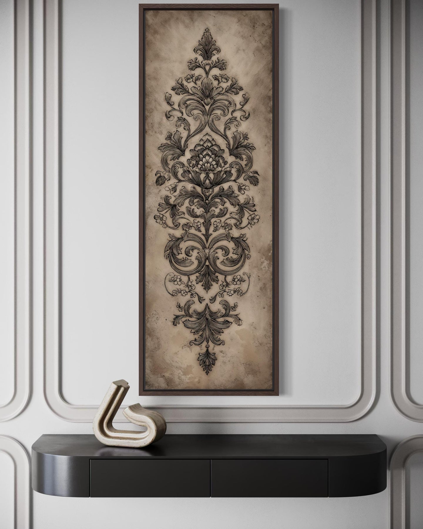 Our Damask canvas wall art is a neutral vertical canvas print featuring an elegant antique French ornamental Damask design arranged in a tall narrow composition that emphasizes graceful decorative symmetry. The artwork centers on a classic European Damask motif that rises vertically through the canvas, forming a refined ornamental structure inspired by historic decorative textiles. The tall orientation allows the pattern to flow upward in a balanced design that naturally fits vertical spaces within a room. This style of Damask ornamentation has long been associated with antique European interiors where intricate decorative patterns appeared in fabrics, carved panels, and architectural decoration. The vertical structure of the composition highlights the elegant scrollwork that defines traditional Damask design. Soft aging within the artwork gives the pattern a gentle vintage character while still presenting a clean modern canvas print. The narrow format allows the artwork to function beautifully in areas where wide horizontal pieces are not suitable. The composition maintains a calm decorative presence while still offering detailed ornamental interest. Its balanced design makes the artwork feel both classic and versatile for many interiors. This elegant composition highlights the beauty of antique French Damask wall art.