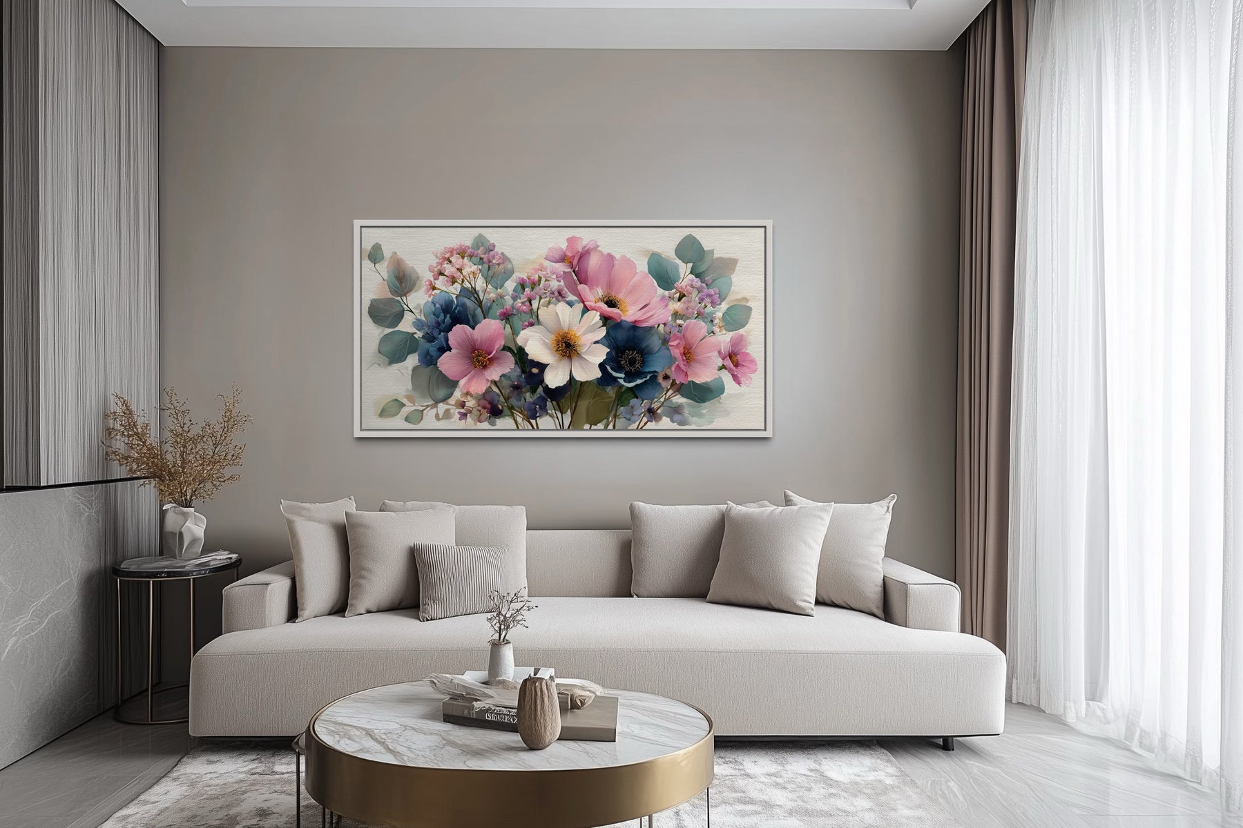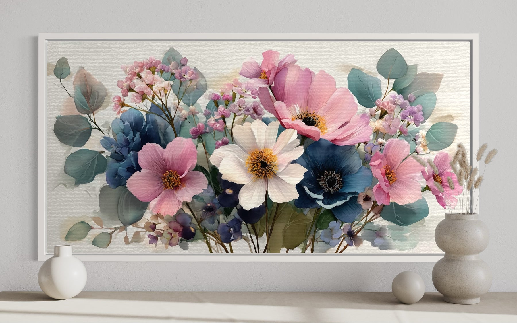 Our pretty blue pink wildflowers wall art captures the gentle beauty of a blooming bouquet in full color, painted in a dreamy, lightly textured style that feels both cheerful and calming. This canvas print features a horizontal arrangement of lush, layered florals bursting from the center—pink peonies, delicate blue cornflowers, soft white blossoms, and greenery all tumbling together in joyful harmony. The floral composition is romantic and slightly rustic, with each petal and stem painted with a hand-touched softness that mimics watercolor without losing depth. Light grey-blue tones in the background give the flowers a floating, airy feel, creating just enough contrast for the colors to glow. The bouquet seems freshly picked, yet timeless, suspended in a moment of spring that never fades. The wide, horizontal format makes it ideal as a statement piece over beds, sofas, or headboards, especially in soft, light-filled rooms. There’s a gentle joy in this artwork—like bringing a garden into the home without needing a vase. Our floral painting offers a splash of freshness and charm that brightens any space with grace.