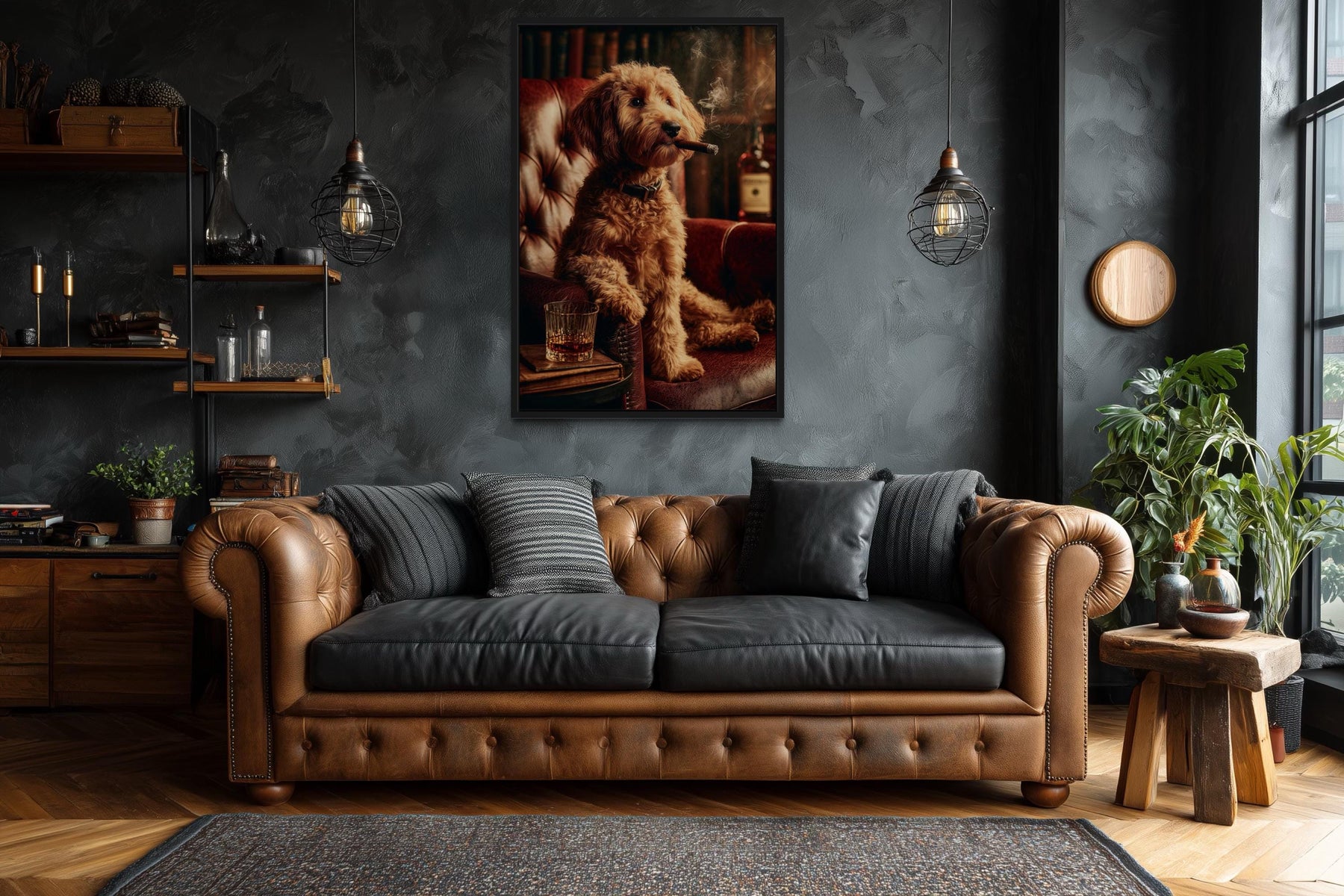 Our red brown Goldendoodle dog canvas wall art fuses humor, elegance, and personality into one unforgettable piece that brings charm and sophistication to any room. The artwork portrays a red-toned Goldendoodle sitting in a stately pose, sipping whiskey and puffing a cigar with the confidence of an old-world gentleman. Painted in a classical portrait style with rich textures and soft lighting, the piece combines playful imagination with timeless artistry. Every detail—from the glimmer of the whiskey glass to the curl of smoke rising through the air—has been meticulously rendered to evoke refinement and personality. The dog’s amber fur glows warmly against a shadowed backdrop, creating a striking contrast that adds both depth and intimacy. The subtle highlights along the muzzle and glass edge showcase the artist’s skill in blending realism with whimsy. This piece bridges humor and art, turning an amusing subject into a genuinely captivating work that feels high-end rather than novelty. The refined lighting and soft brushwork give it the air of a vintage portrait, while the subject matter ensures it never takes itself too seriously. Perfect for art lovers with a sense of humor, it’s as expressive and unique as the Goldendoodle itself. Intelligent, bold, and beautifully detailed, this dog painting stands as a celebration of sophistication with a wink of mischief.