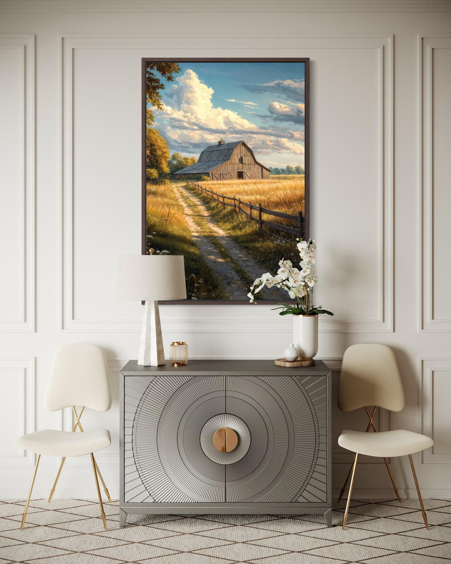 This vertical canvas print fits effortlessly into farmhouse-style interiors, rustic kitchens, and warm country living rooms where authenticity and nature-inspired decor are key. Whether mounted above a reclaimed wood console, beside a stone fireplace, or in a breakfast nook surrounded by vintage decor, this piece enhances the inviting, lived-in feeling of a rural-inspired home. It also works beautifully in cottage-themed bedrooms or entryways, especially those that feature antique touches like iron lanterns, raw wood beams, or whitewashed walls. The vertical format allows it to make use of narrow wall spaces, fitting between windows or doors, or drawing the eye upward in a cozy space. Its blend of natural scenery and nostalgic architecture complements rooms with earthy textures, jute rugs, linen drapes, and neutral color palettes. It adds a grounded focal point that’s emotional without being overwhelming—offering story, place, and peace in a single scene. For homes that celebrate slow living, seasonal beauty, or pastoral elegance, this artwork becomes more than decoration—it becomes a window into a simpler way of life. Its detail and warmth make it ideal for any space craving a little sunlight and tradition. Our rustic barn canvas wall art brings rural character and golden charm to farmhouse-inspired homes.