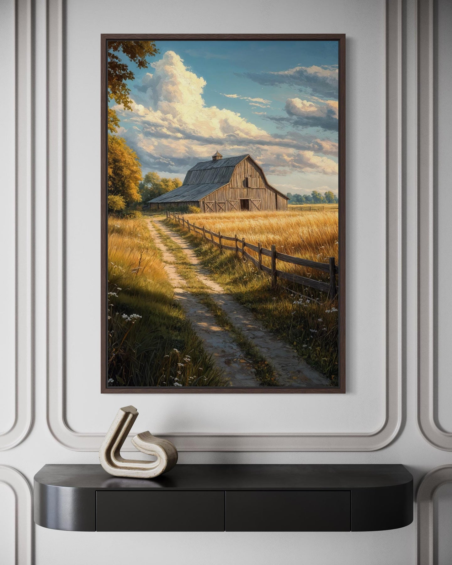 Our rustic barn wall art is a vertical canvas print that captures the timeless beauty of a golden field landscape framed by a vintage farmhouse setting. At the center of the composition stands a weathered wooden barn, its aged timber siding glowing under the warmth of golden hour light. Behind the barn, a sloping mountain rises into soft blue skies dotted with fluffy clouds, giving the entire piece a sense of peaceful openness and rural charm. The foreground features tall grass in golden tones, gently swaying in rows that lead the eye toward the distant tree line and hills. The textures in the barn’s roof and walls are painted with a fine attention to age and detail, evoking the passage of time and the quiet dignity of country life. Light filters through the scene with a warm glow, bringing out the amber hues of the field and the dusty blue in the distance. A dirt path meanders beside the structure, suggesting travel, work, and connection to the land. Though realistic in execution, the brushwork carries a painterly softness, blending old-world charm with decorative ease. Our rustic barn painting offers a warm, nostalgic view of rural America through evocative rustic barn wall art.