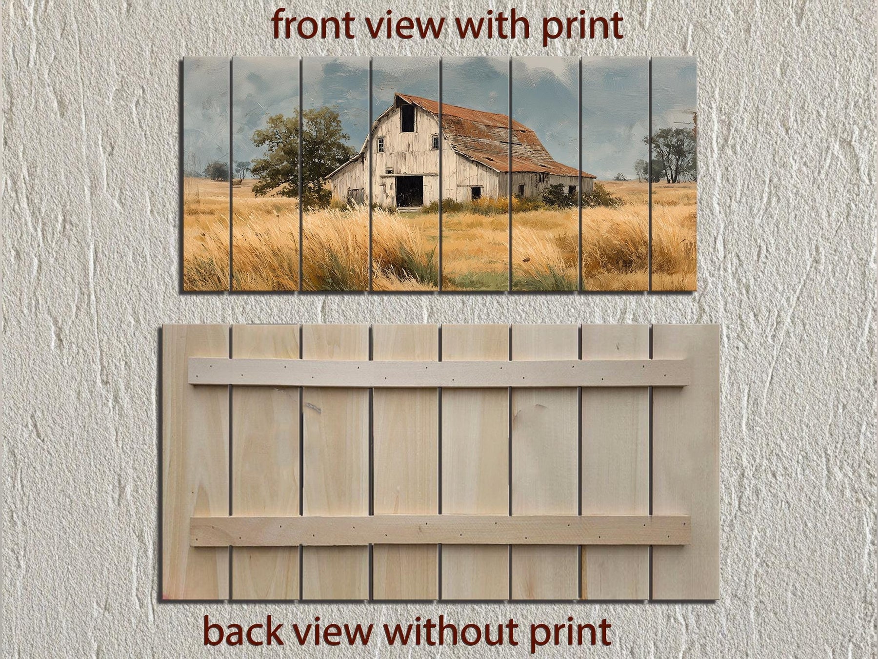 Our rustic barn wood wall art captures the nostalgic beauty of the countryside with a warm, inviting charm that feels timeless and authentic. This artwork features a weathered old barn set in a golden wheat field beneath a soft, open sky, evoking memories of simpler days and the peaceful rhythm of rural life. The scene is printed directly onto new wood, with a beautifully distressed finish that gives the painting an aged, vintage appearance while maintaining the durability and quality of modern craftsmanship. Each board showcases subtle grain patterns that enhance the character of the image, giving it natural texture and depth. The barn stands proudly at the center, surrounded by tall amber stalks swaying in the late-summer breeze, while distant trees and a pale blue sky complete the serene composition. The weathered effect adds a touch of farmhouse nostalgia, transforming the piece into more than just wall décor—it becomes a story of land, heritage, and endurance. This rustic barn print combines artistry and warmth, creating an atmosphere of comfort and authenticity that only rural imagery can convey. Whether viewed up close or from across the room, its balance of color and texture makes it both calming and visually captivating. Each detail celebrates rustic tradition and modern artistry, resulting in distressed wood wall art that feels heartfelt and enduring.