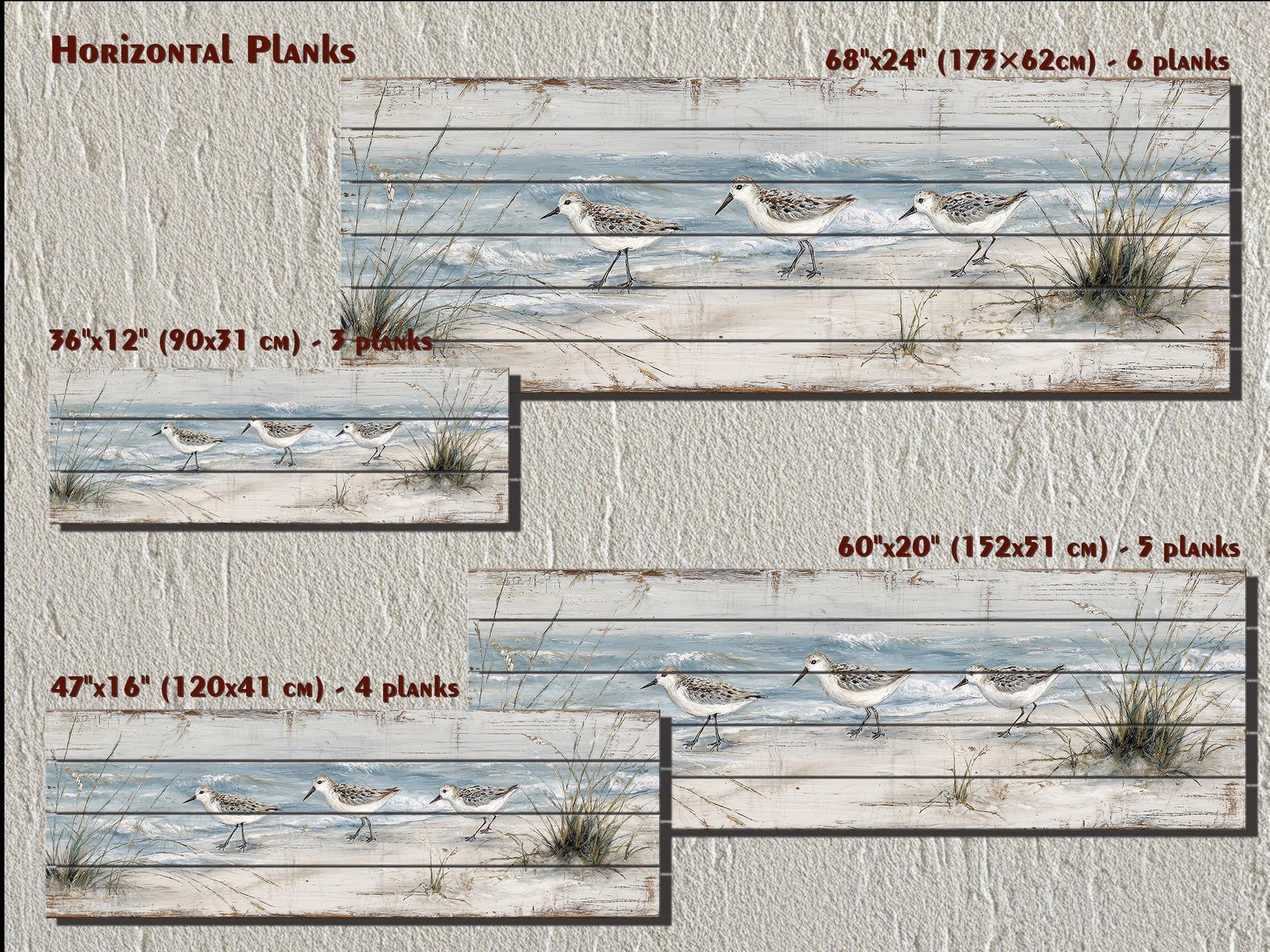 Panoramic wood wall art featuring sandpipers on a beach, available in four horizontal sizes.