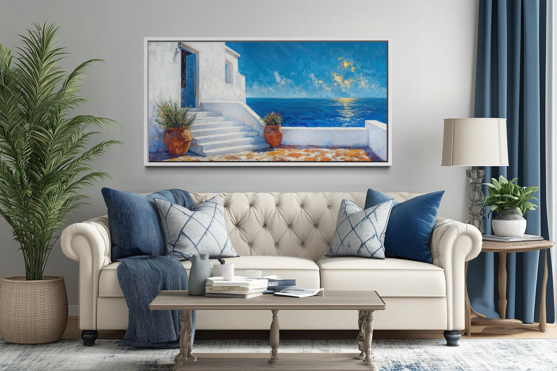Santorini coastal villa wall art featuring a blue door and ocean view above a white sofa.