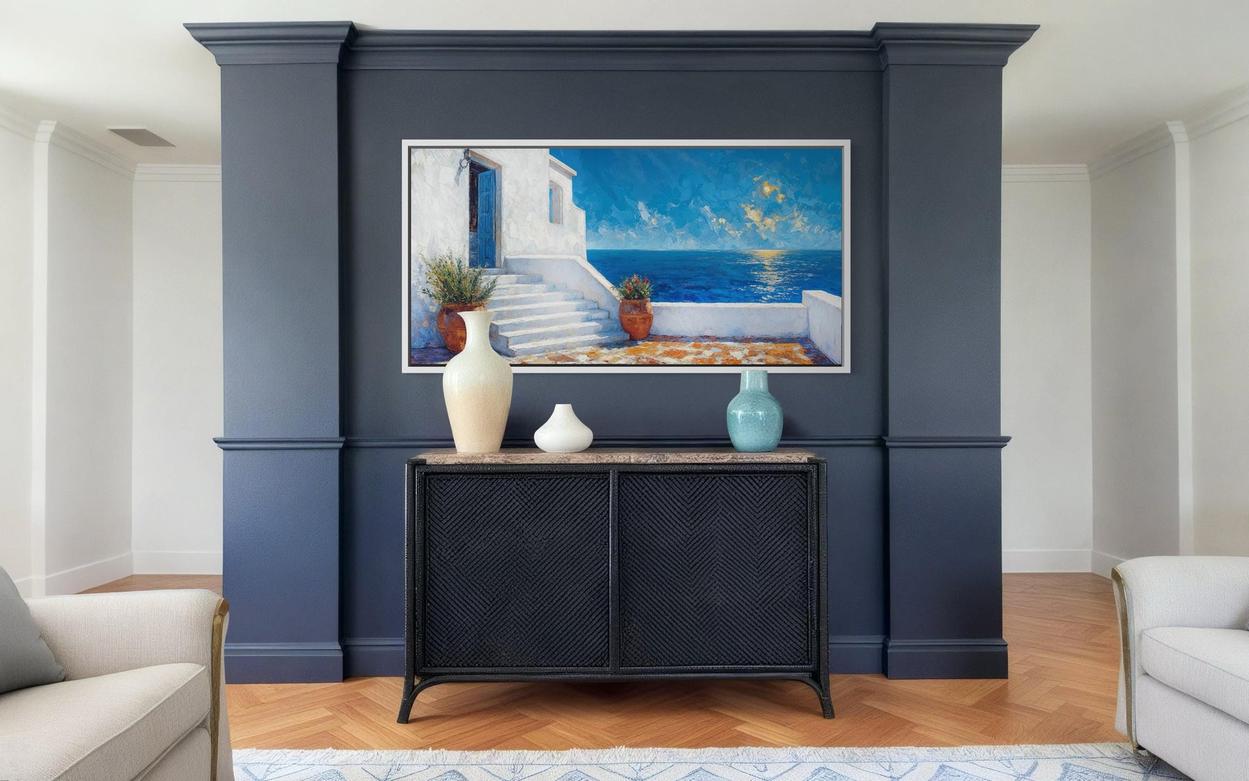 A horizontal canvas painting of a Santorini villa overlooking the blue Aegean Sea in a modern room.
