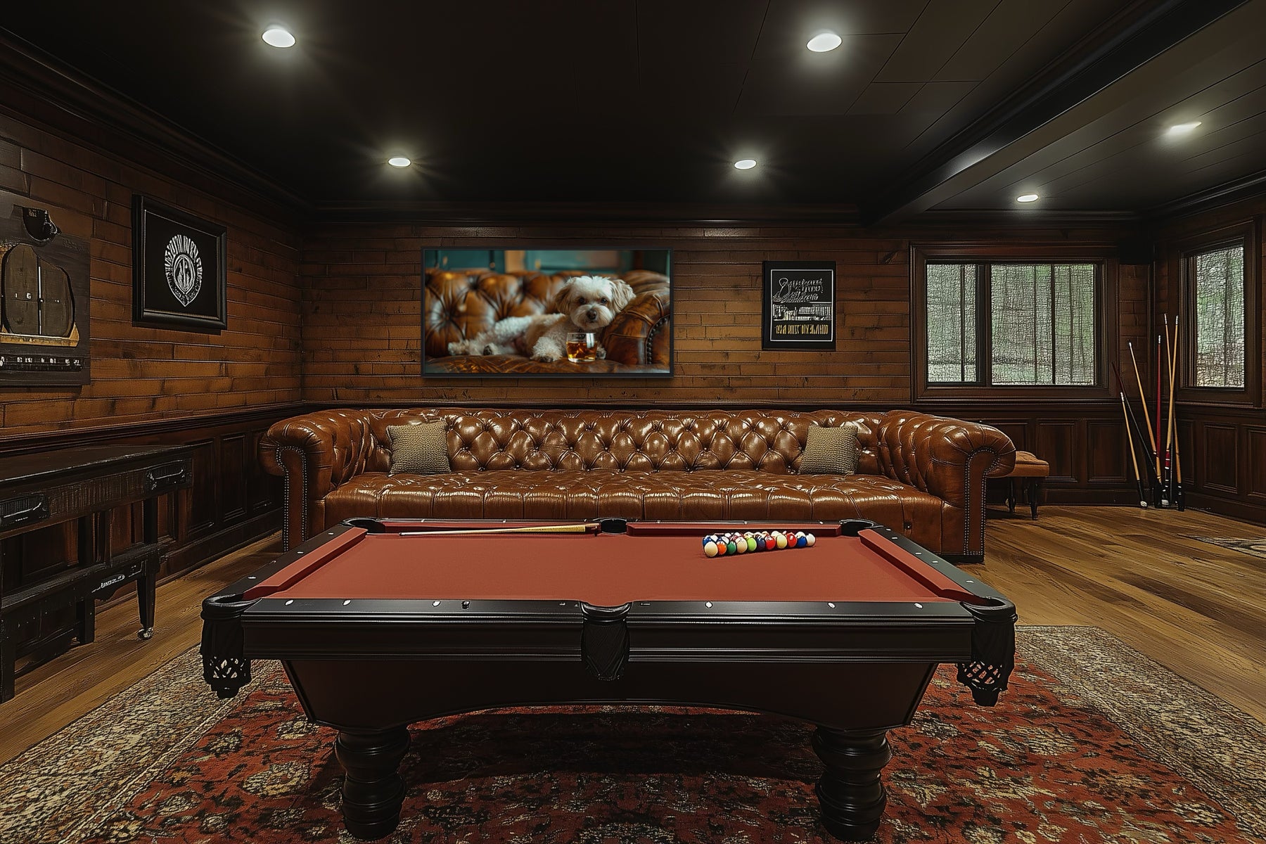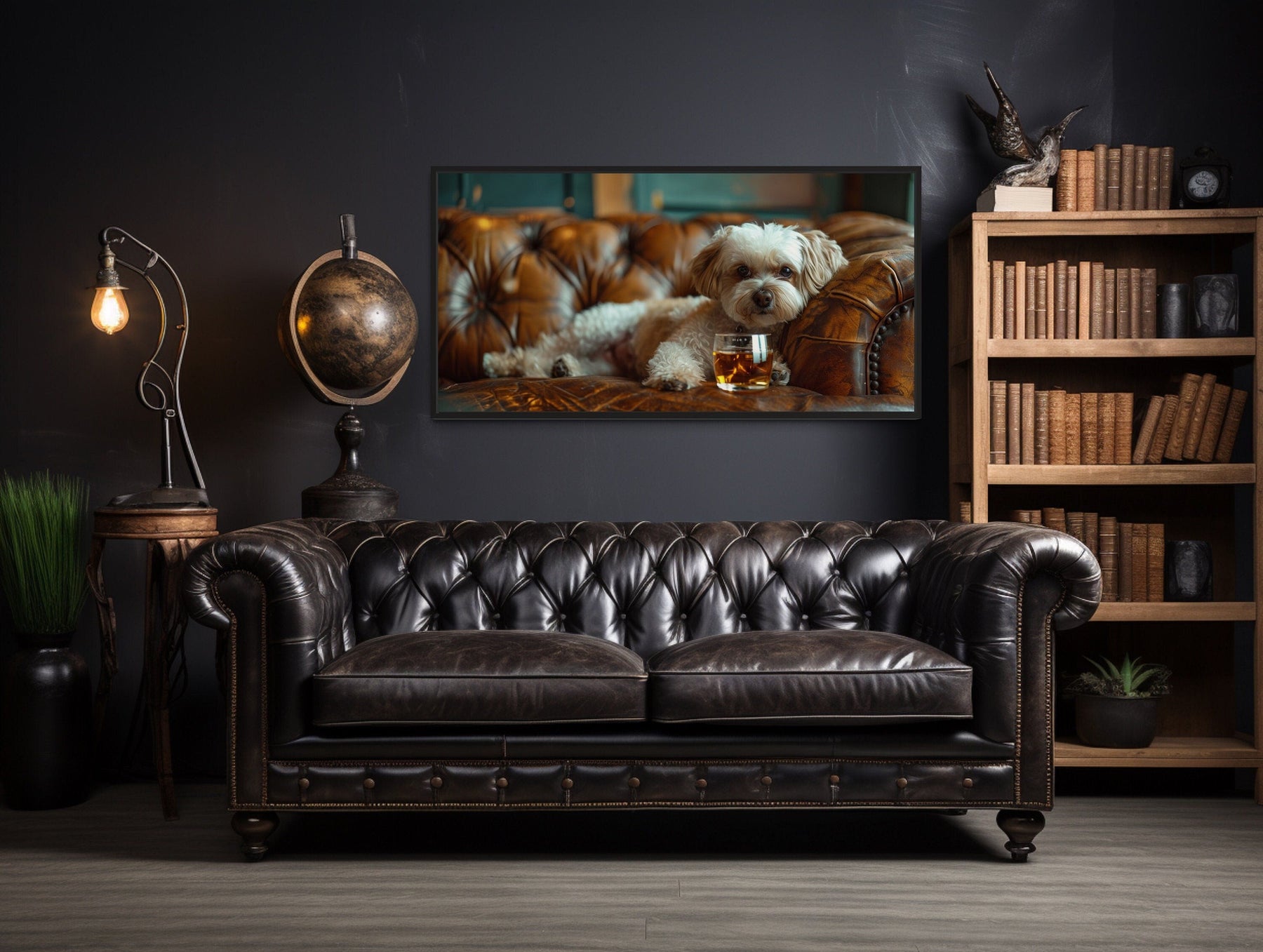 This funny pet painting is perfect for homes with a playful or eclectic aesthetic. Its humorous design and vibrant colors make it an excellent addition to spaces with casual and comfortable furnishings. The Shih Tzu wall art complements interiors that emphasize fun and a connection to pets, adding a touch of whimsy. It's also a great fit for bar areas and man caves, providing a lighthearted and entertaining focal point. Ideal for pet lovers and those who appreciate amusing artwork, this piece effortlessly enhances the aesthetic of any room. Whether you're looking to create a cheerful retreat or simply add a touch of humor to your home, this canvas print is the perfect choice. Transform your space with the playful beauty of this Shih Tzu on couch drinking whiskey artwork.
