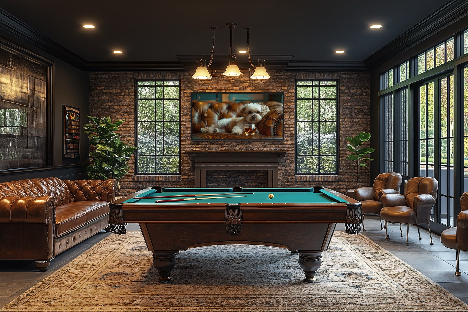 The Shih Tzu canvas print showcases a rich palette of warm browns, soft whites, and deep blues. The cozy couch and background elements contrast beautifully with the white and brown fur of the Shih Tzu, creating a striking and humorous effect. The play of light and shadow adds depth and realism to the piece, making the scene feel almost lifelike. This painting embodies the playful and whimsical beauty of pet-themed art, perfect for creating a joyful environment in your home. The colors are vividly printed on canvas, ensuring they remain vibrant and true to life. Whether displayed in a living room or bar area, the cheerful color scheme will enhance any space.