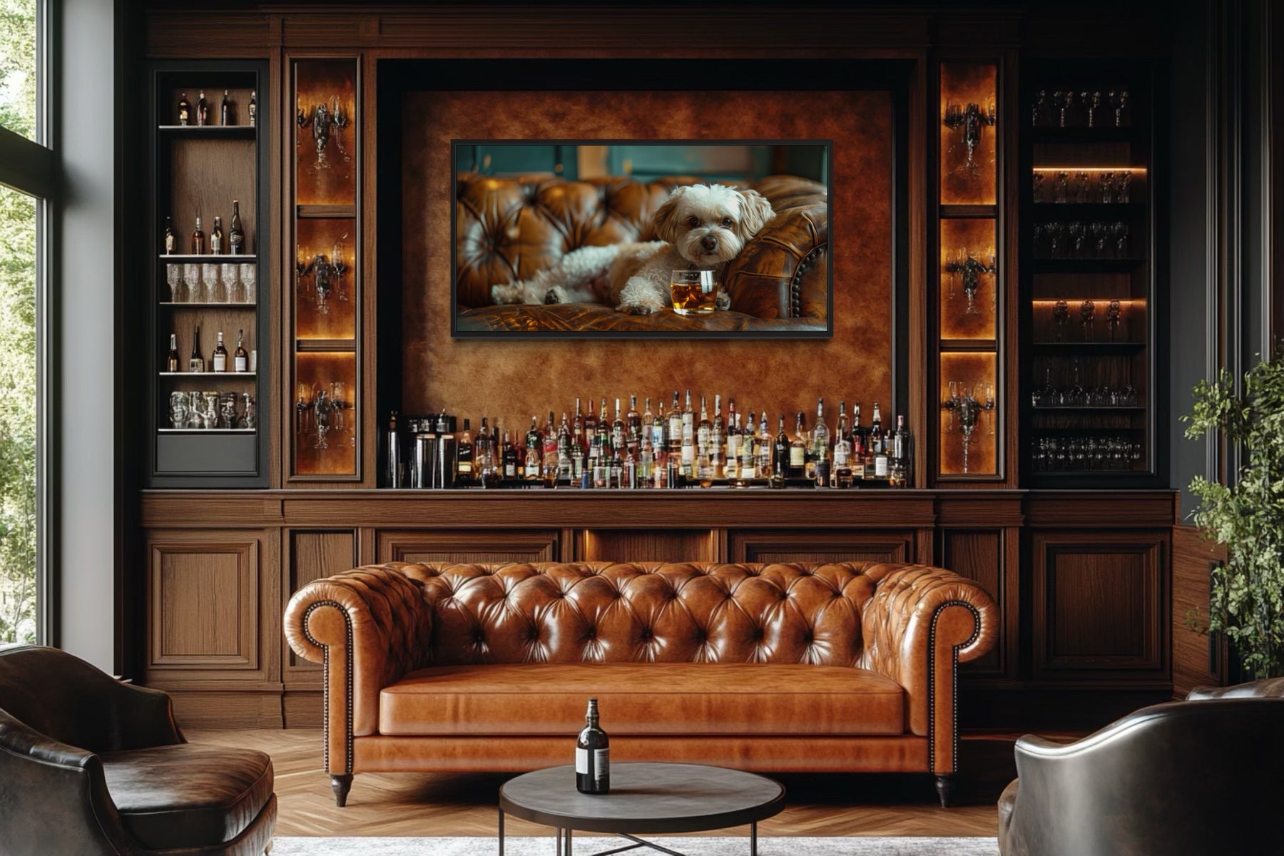 Add a touch of humor and charm to your home with our Shih Tzu on couch drinking whiskey wall art. This delightful piece features an adorable Shih Tzu lounging on a couch with a glass of whiskey, capturing a whimsical and entertaining moment. The detailed depiction and playful theme make this canvas print a perfect addition to any room with a sense of fun. Ideal for pet owners and dog lovers, this wall art brings a smile and a touch of lightheartedness to your space. Ready to hang, this artwork is available as a framed canvas print to enhance your decor.