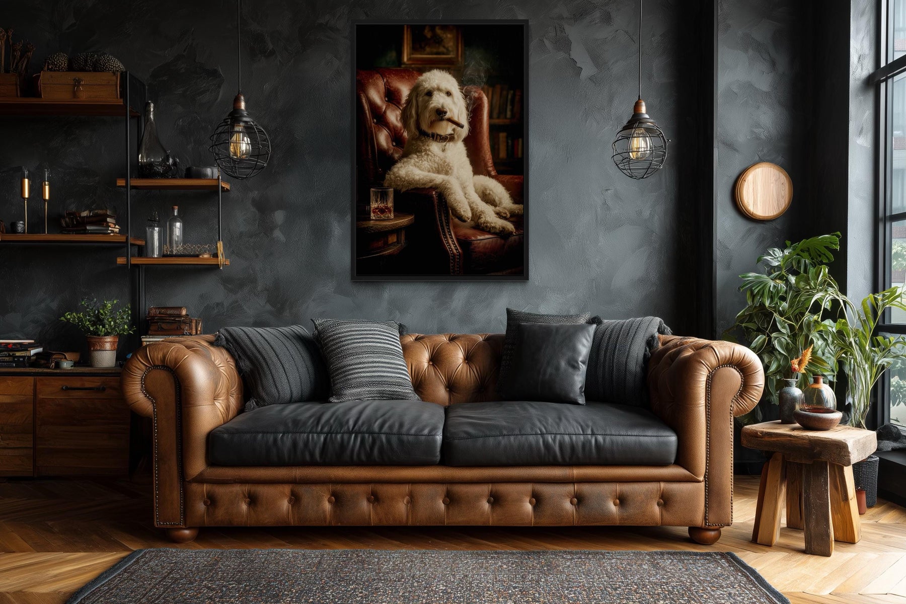 This Goldendoodle canvas wall art is a perfect addition for masculine interiors, modern lounges, cigar rooms, or eclectic homes that value individuality and a touch of humor. It thrives in spaces that blend old-world charm with modern wit—think leather armchairs, brass lamps, and whiskey shelves beneath warm ambient lighting. In a home bar or study, it becomes an instant focal point, offering both personality and refinement that invite conversation. For man caves and executive offices, it introduces a stylish balance between playfulness and class, creating an atmosphere that feels both bold and cultured. Its rich tones pair effortlessly with deep wood textures, dark walls, and moody furnishings, making it a natural fit for rustic or industrial interiors. Even in modern apartments, the piece adds unexpected charm—a tongue-in-cheek statement of taste and humor. Its framed presentation gives it a gallery-quality finish, transforming what could be whimsical into something tastefully artistic. The composition’s symmetry and elegance make it equally appealing to dog lovers, collectors, and those with an eye for unconventional art. Bold, distinctive, and unapologetically charming, this Goldendoodle artwork stands out as a signature piece for those who appreciate wit wrapped in refinement, ending with the unforgettable personality of this white Goldendoodle dog canvas wall art.
