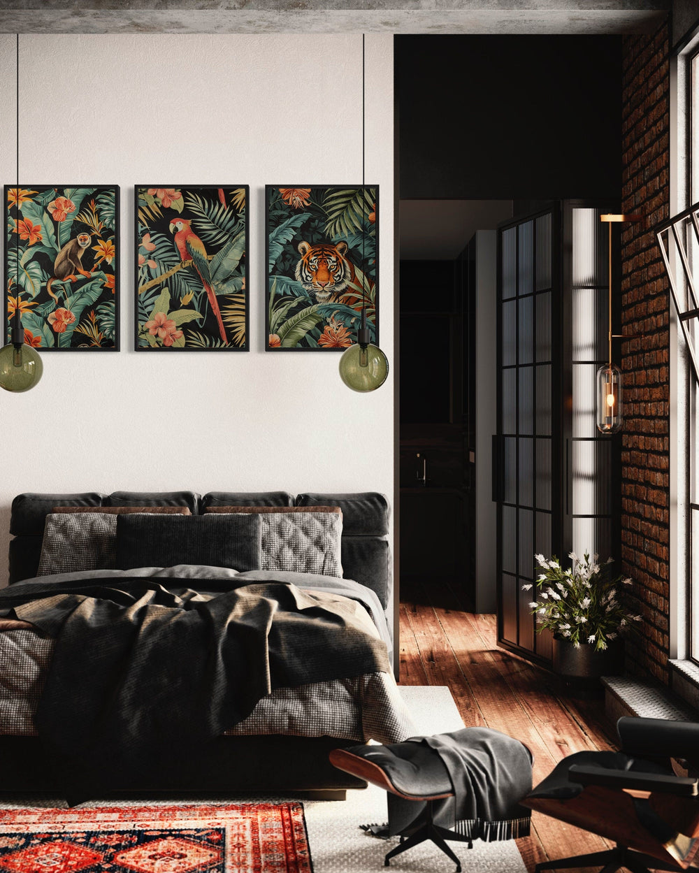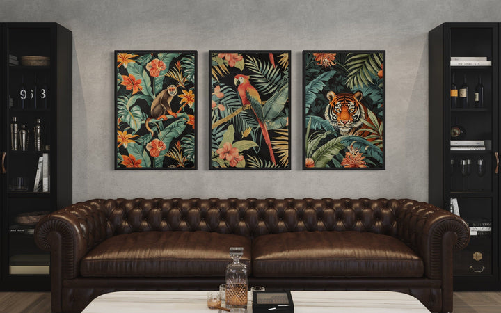 Discover the enchanting allure of mid century modern set of 3 tropical wall art with this stunning canvas print. Featuring a vibrant jungle scene with a parrot, a monkey, and a tiger set against lush foliage, this mid century modern jungle art captures the essence of a verdant rainforest. The intricate details and lively colors create a mesmerizing scene that brings the vitality of the tropics into your home. Perfectly blending the elegance of mid century modern design with the wild beauty of nature, this piece is a captivating addition to any living space. Transform your room with the dynamic energy of this mid century modern rainforest painting, and enjoy the perfect harmony of sophistication and exotic charm.