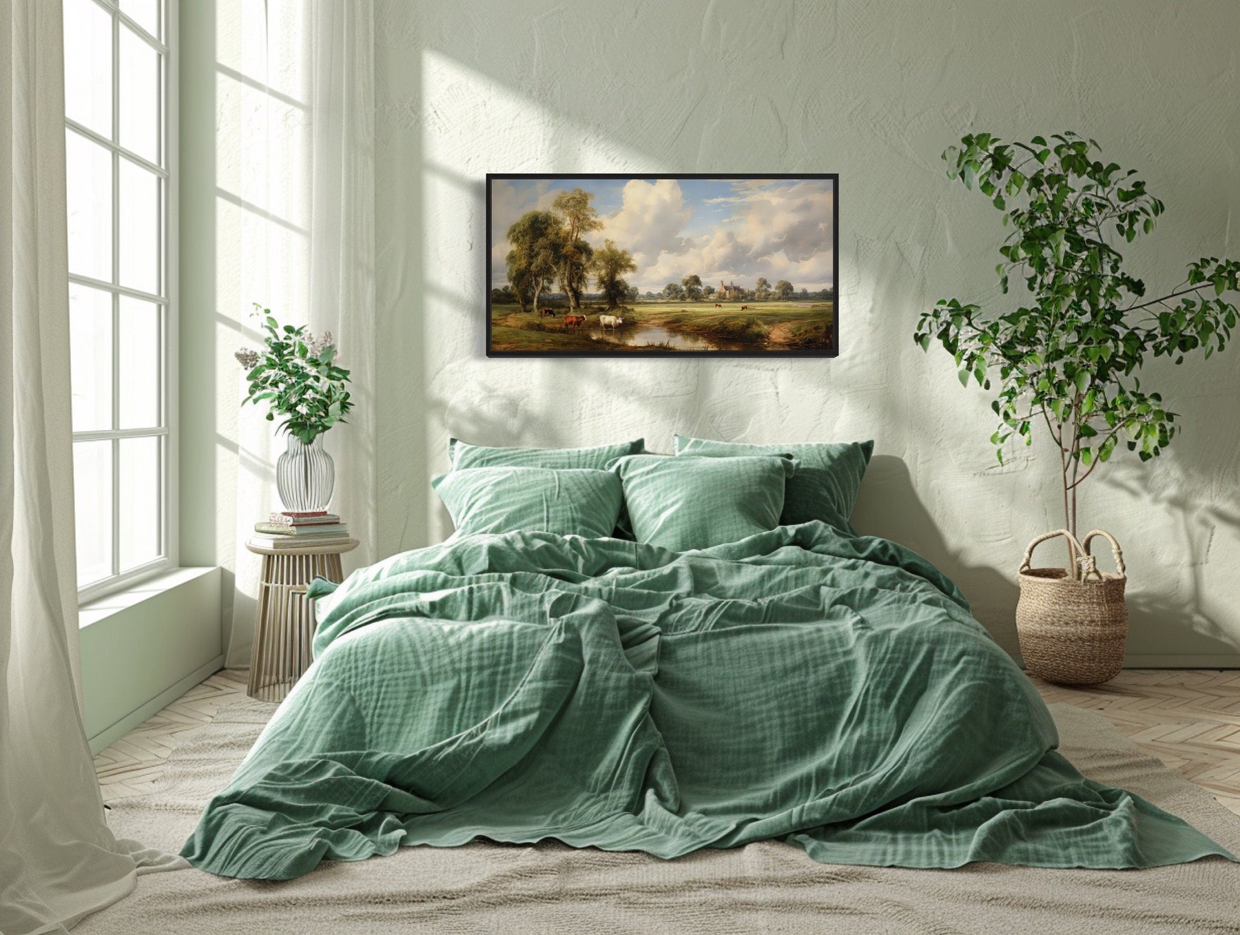 This antique style pastoral country landscape painting with cows offers a serene depiction of rural charm. Capturing the essence of lush greenery and grazing cows, this wall art transforms your space into a tranquil countryside retreat. Perfectly framed, this artwork is ideal for farmhouse kitchens, country-inspired dining rooms, or cozy living areas. The detailed brushstrokes evoke the sophistication of classic pastoral art, celebrating the timeless beauty of rural life. With its calming tones and nostalgic appeal, this canvas adds character and warmth to spaces steeped in rustic or antique decor. Whether as a focal point in a dining room or an accent for a sitting area, this wall art enriches your decor with its vintage elegance. Elevate your home with the tranquil beauty of this pastoral country painting.