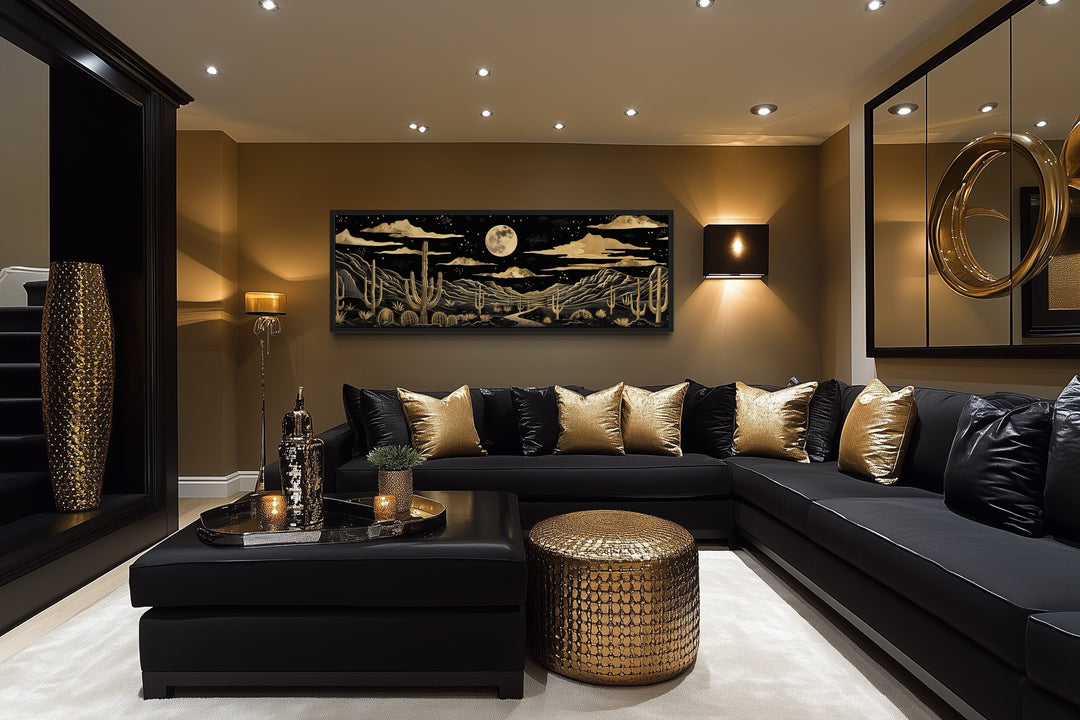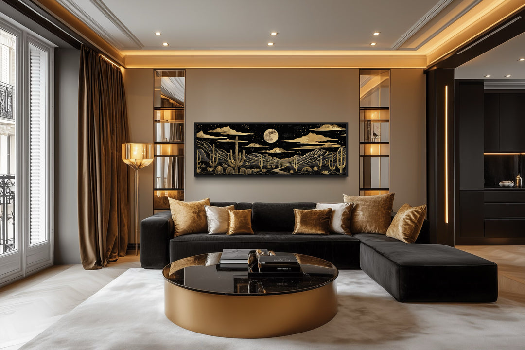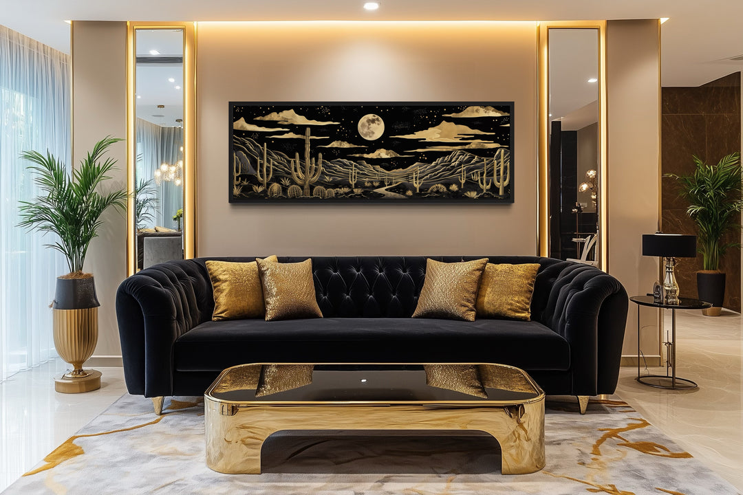 A luxurious and balanced palette defines this long horizontal framed canvas wall art, featuring deep black, radiant gold, and subtle neutral undertones. The dark backdrop provides a dramatic contrast, allowing the golden cacti and desert elements to stand out with striking brilliance. Variations in gold tones add depth, giving the piece a multi-dimensional effect that enhances its artistic elegance. Hints of soft bronze and muted beige introduce warmth, making the artwork versatile enough to complement a range of decor styles. The interplay of light and shadow creates a sophisticated atmosphere, adding movement and texture to the composition. Under different lighting conditions, the metallic gold shimmers subtly, enhancing the piece’s luxurious appeal. The sleek contrast between minimal black space and intricate golden detailing makes it an ideal choice for modern, industrial, and upscale interiors. Whether paired with neutral furnishings or rich, earthy tones, this long horizontal framed canvas wall art elevates the ambiance with refined simplicity.