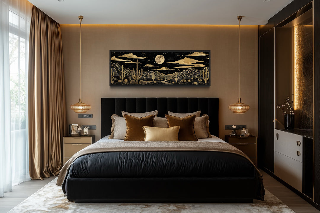 This framed black gold desert wall art is an ideal addition to modern, mid-century, and luxury-inspired interiors. Its panoramic design makes it a stunning focal point above a sofa, bed, or office desk, effortlessly enhancing large wall spaces. In a minimalist setting, it adds a bold yet understated elegance, creating a refined and tranquil atmosphere. A contemporary living room benefits from its sleek aesthetic, complementing metallic accents, dark wood furniture, and high-end finishes. The warm golden hues bring a subtle glow to a bedroom, making it a perfect choice for those seeking a peaceful yet sophisticated retreat. In an office or study, the structured yet organic forms reinforce themes of balance, ambition, and natural beauty. The long horizontal format allows for seamless integration into narrow spaces, making it perfect for hallways or above sideboards. Whether displayed in a modern apartment, high-rise loft, or desert-inspired home, this framed black gold desert wall art brings a touch of elegance, simplicity, and timeless charm.