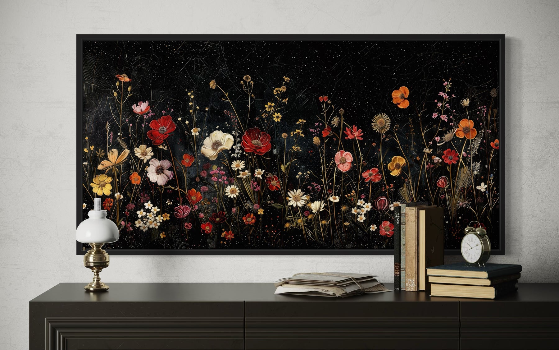 Our black wildflowers field at night wall art captures the captivating beauty of nature bathed in darkness. This stunning canvas features delicate wildflowers silhouetted against a dramatic nighttime backdrop, evoking a sense of mystery and elegance. Each bloom stands out vividly, as if illuminated by moonlight, creating an enchanting visual contrast. The intricate detailing of the flowers adds depth and realism, while the dark tones lend a sophisticated, moody aesthetic. Perfect for those who appreciate subtle yet impactful decor, this piece transforms walls into works of art. The framed canvas enhances its refined appeal, making it a versatile centerpiece for thoughtfully curated spaces. Whether you're looking to add drama to a living room or elegance to a bedroom, this painting sets the perfect tone. Bring the allure of a serene night to your home with this black wildflowers wall art.