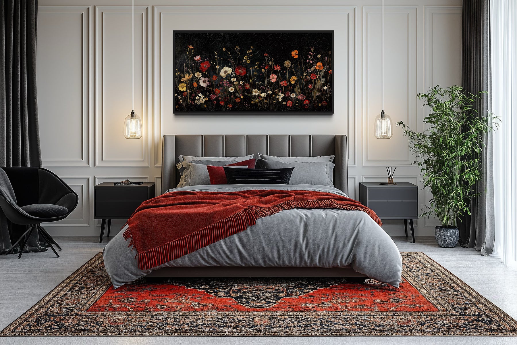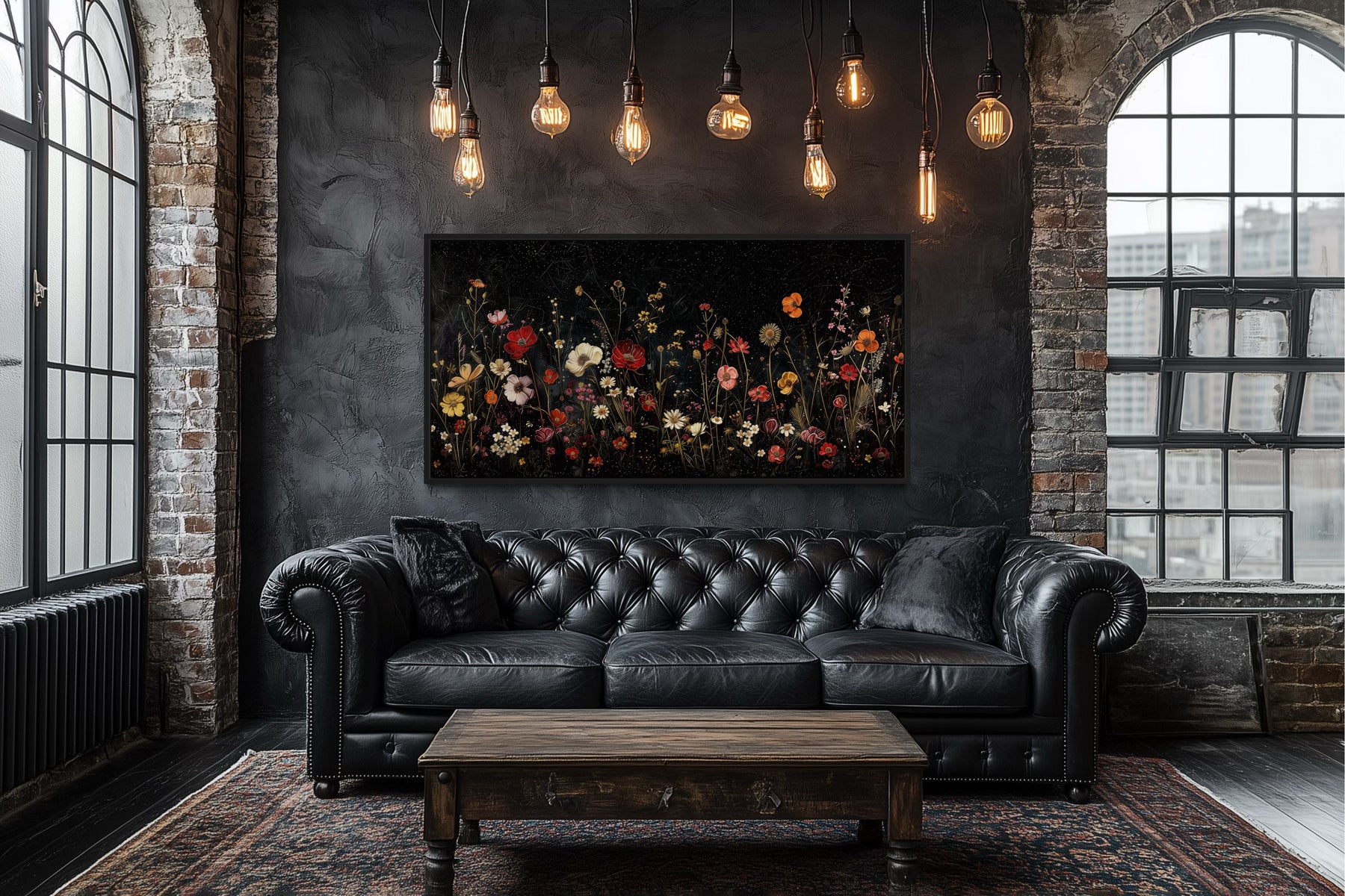 This black wildflowers wall art is an ideal choice for elegant living rooms or tranquil bedrooms. Its moody aesthetic complements modern interiors with dark accents or rustic spaces featuring natural wood furniture. Perfect for creating a focal point, it pairs beautifully with muted textiles, metallic accents, and warm lighting. In a bedroom, it brings a serene and romantic ambiance, perfect for winding down at the end of the day. Its refined charm also makes it suitable for stylish entryways or cozy reading nooks, adding character to every corner. Those with a love for nature-inspired decor will find this piece a striking addition to their home. Whether displayed above a sofa or bed, this framed canvas elevates your space with its dramatic and sophisticated vibe. Complete your decor with this black wildflowers field wall art, where elegance meets mystery.