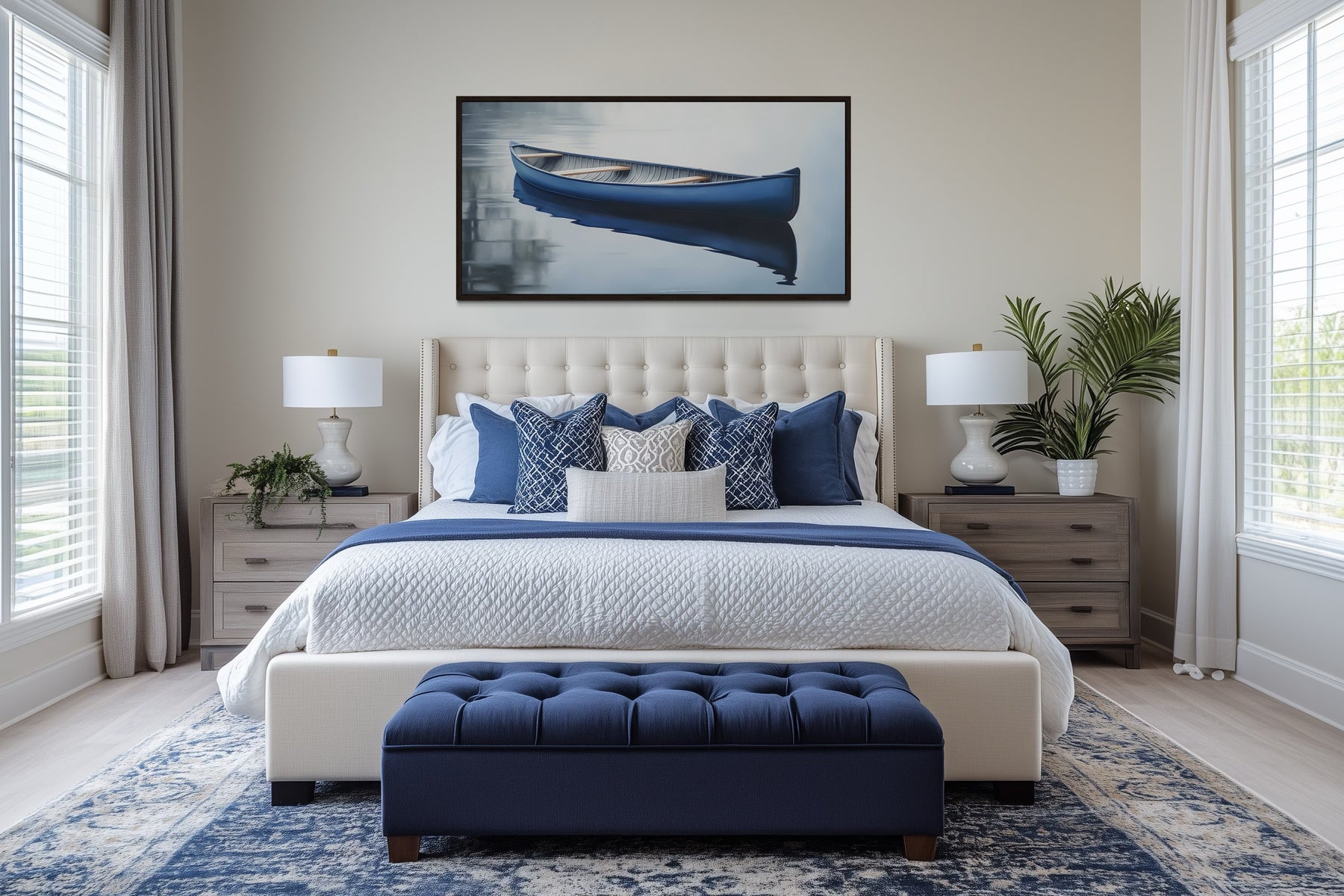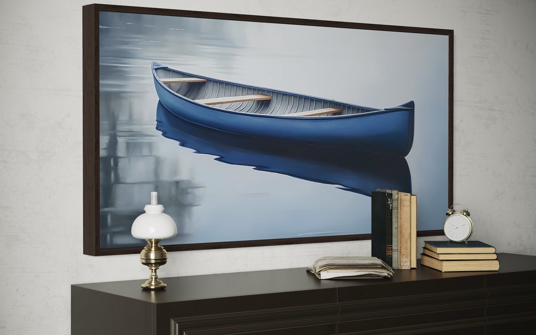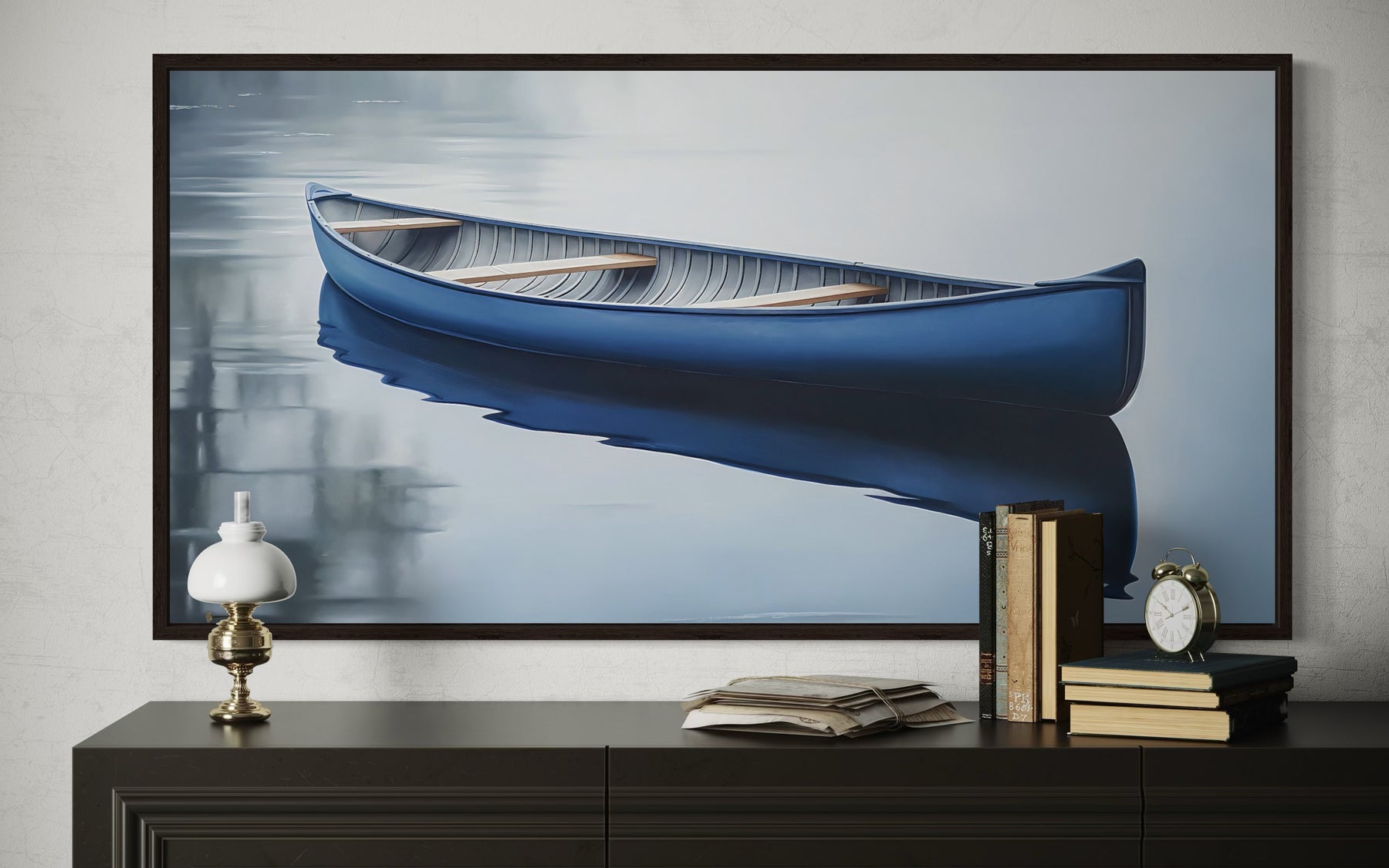 This blue canoe wall decor is a perfect fit for lake houses, coastal-inspired homes, or spaces with a modern minimalist style. Ideal for living rooms, bedrooms, or above a sofa, its extra-large design fills expansive walls beautifully. The clean and contemporary aesthetic also makes it suitable for hallways or high-traffic areas that need a peaceful focal point. For beach houses, this painting complements light, airy interiors with white or neutral furnishings, creating a fresh and serene atmosphere. Its cool tones pair effortlessly with modern decor, wood accents, or natural textures, offering a cohesive and polished look. Whether displayed in a reading nook or entryway, it brings a sense of calm and quiet sophistication. Enrich your home with this framed blue canoe canvas wall art, designed to capture the timeless serenity of lake house living.