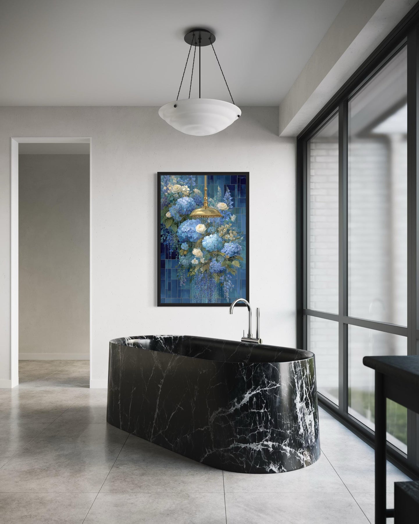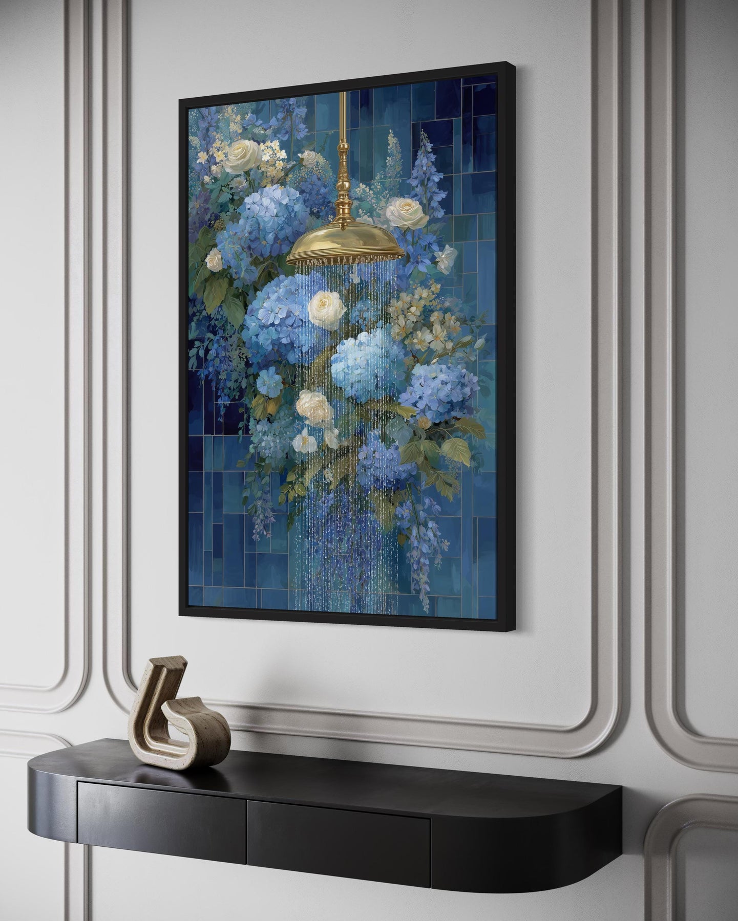 This Blue Floral Shower Romantic Bathroom canvas wall art is ideally suited for spa-like bathrooms and serene dressing areas where relaxation and beauty are priorities. Its gentle floral shower theme harmonizes perfectly with soft towels, natural stone, and polished fixtures, enhancing the feeling of a personal retreat. In a spa-inspired bathroom, it pairs seamlessly with neutral tiles and light wood finishes, adding a pop of cool blue that calms the senses. In a dressing area or vanity space, it provides a romantic backdrop that encourages quiet, reflective moments. The high-quality canvas print ensures easy maintenance in humid environments, keeping colors vibrant and details sharp. Its vertical format fits gracefully beside mirrors, bathtubs, or tall storage units, making it a practical and aesthetic choice. The Blue Floral Shower Romantic Bathroom painting brings a touch of nature indoors, creating a connection to peaceful gardens and fresh spring mornings. Its soothing palette complements both contemporary and classic bathroom designs, offering flexibility without sacrificing style. Whether displayed as a single focal point or paired with soft lighting and greenery, it creates a serene atmosphere that elevates daily routines. Complete your personal spa-like retreat with the calming elegance of Blue Floral Shower Romantic Bathroom wall art.