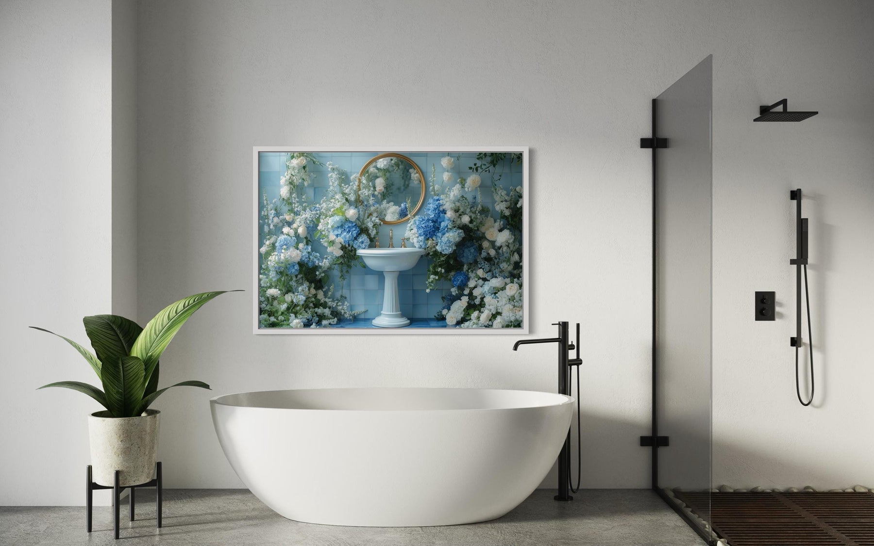 Our Blue Floral Sink Bathroom canvas wall art fills any bathroom with a refreshing combination of elegance and calm, transforming ordinary walls into a beautiful spa-like retreat with lasting artistic impact. This carefully designed canvas print features a vintage-inspired white sink surrounded by lavish blue blossoms, every petal and stem painted with the soft movement of a gentle morning breeze. The composition captures the natural beauty of delicate garden flowers while blending subtle modern accents, creating a balance between timeless charm and contemporary sophistication. Gentle brush textures and layered shading give each bloom and leaf lifelike depth, allowing the viewer to feel immersed in the quiet freshness of nature. From the flowing arrangement of blossoms to the graceful curve of the porcelain sink, every element has been chosen to bring serenity and refinement to bathroom décor. Premium canvas printing ensures rich color saturation and long-term vibrancy, so the Blue Floral Sink Bathroom canvas print remains captivating for years to come. Whether placed above a freestanding tub, centered over a double vanity, or used as a striking accent in a guest bath, it provides a daily reminder of the peaceful beauty of flowers and water. Beginning and ending with natural elegance, this Blue Floral Sink Bathroom wall art enriches your home with enduring freshness and quiet luxury.